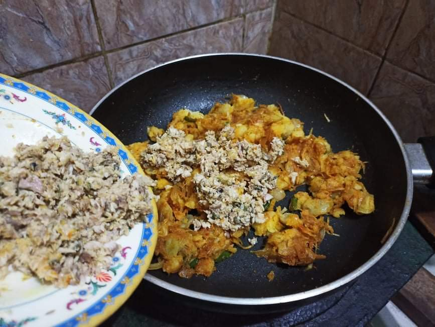• এরপর সেখানে কাঁটা বেছে রাখা মাছ গুলো দিয়ে দিতে হবে। এবং ভালো করে নেড়ে দিতে হবে।