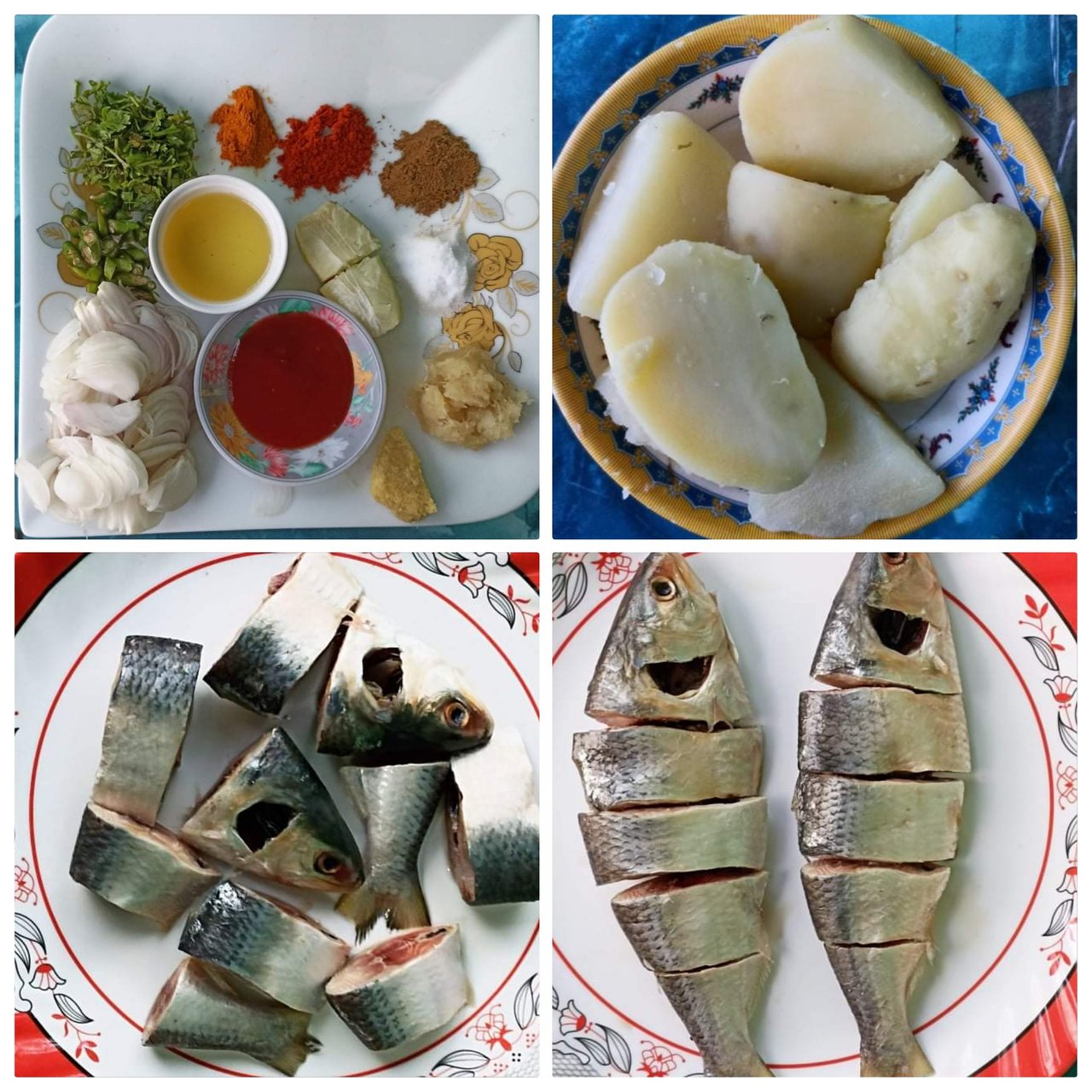 • প্রথমে আমি মাছ দুটোকে নিয়ে ভালোভাবে কেটে পরিষ্কার পানি দিয়ে ধৌত করে নিলাম। তারপর মাছের টুকরোগুলোর মধ্যে হলুদের গুঁড়া, লবণ ও মরিচের গুঁড়া পরিমাণমতো দিয়ে ভালো করে মিশিয়ে নিলাম।