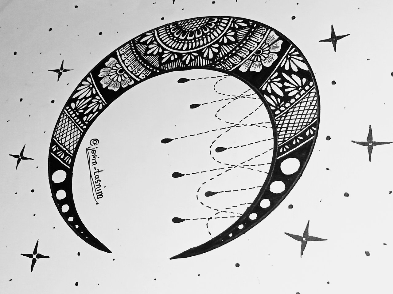 এরপর চাঁদের দুই পাশে ক্রমান্বয়ে বড় থেকে ছোট আকারের অনেকগুলো সার্কেল এঁকে নিব। এবং বাড়তি অংশটুকু জেল কলমের সাহায্যে ভরাট করে নিব।