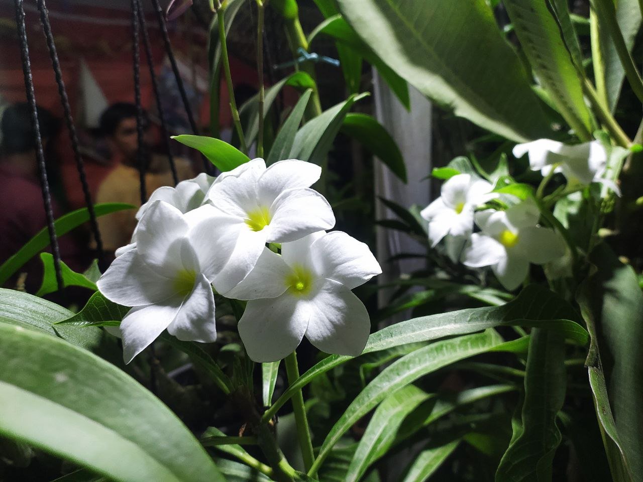 এই ফুলটির নাম চম্পা ফুল। যার ইংরেজি নাম Plumeria। পাচঁটি পাপড়ি যুক্ত চারপাশে সাদা মাঝখানে হলুদ বর্ণের কিছু অংশ রয়েছে। একটি ডালে চার থেকে পাচঁটি ফুল ফুটে। এই ফুুলটির জন্ম বিদেশে হলেও বাংলাদেশে অনেক বাগানেই এই ফুলটি দেখা যায়।