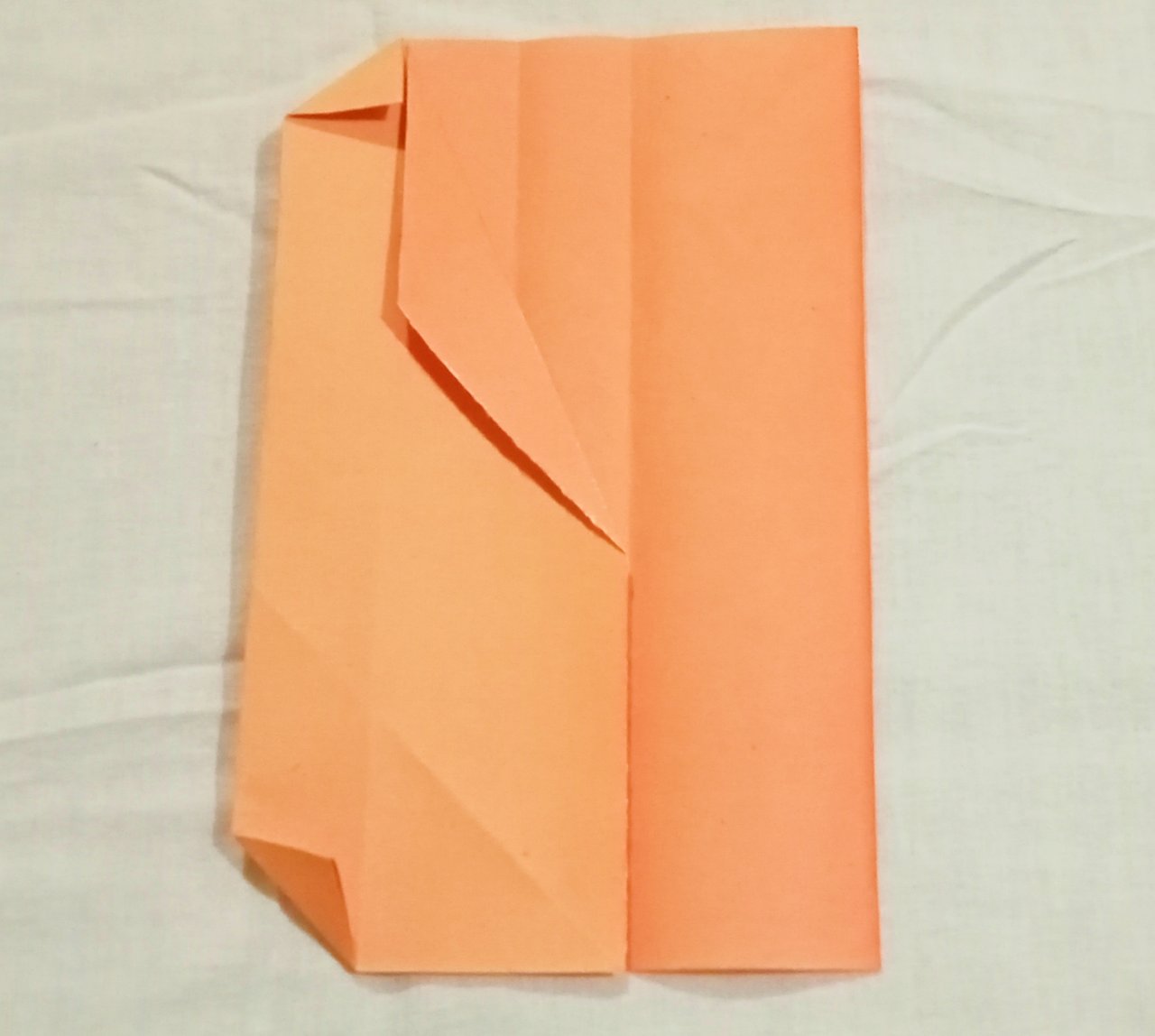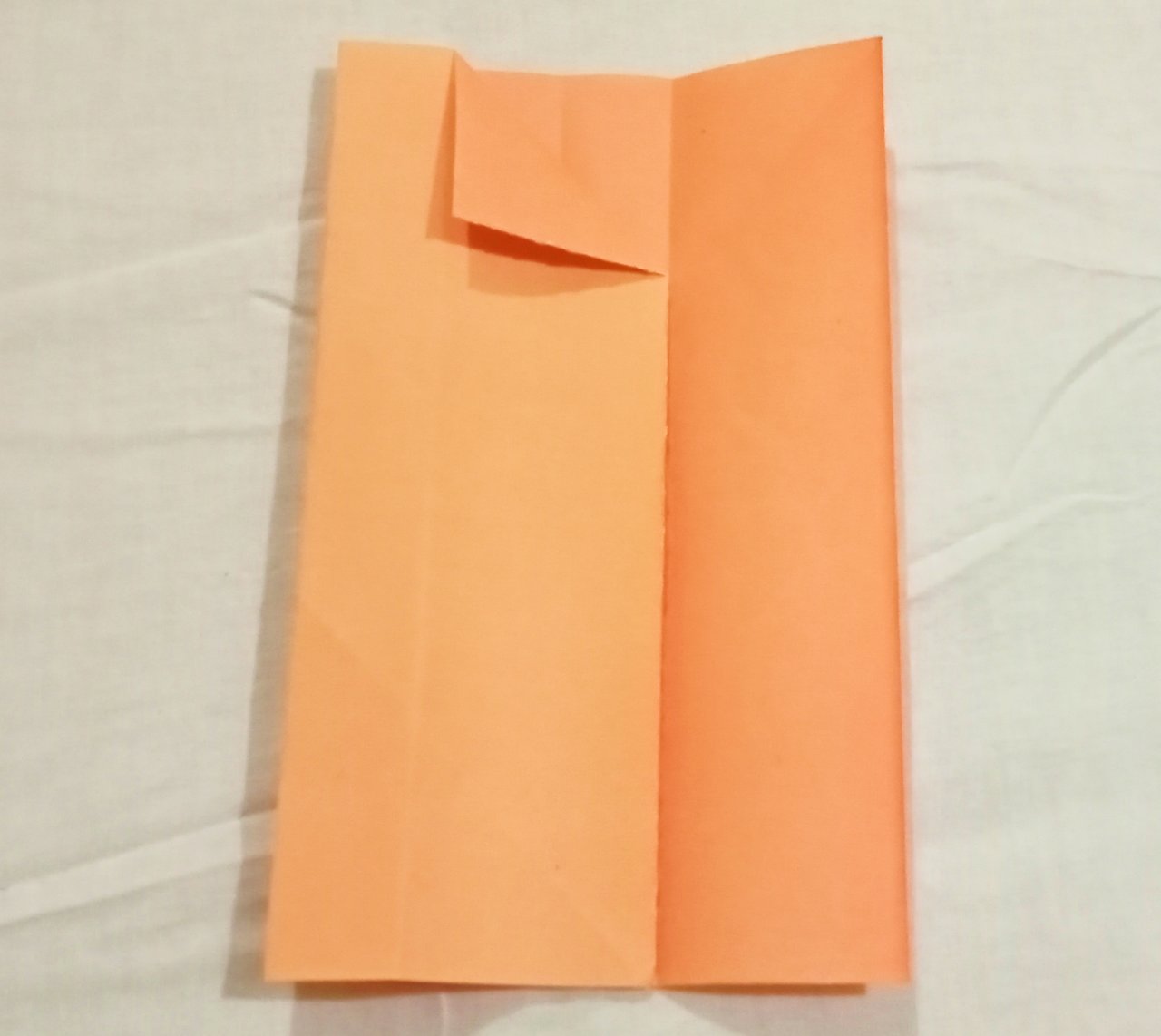 ৬। এবার রঙিন কাগজের মাথা ভাঁজ করে নেয়ার পর, চিত্রের মত করে আরও একটি ভাঁজ দিতে হবে।