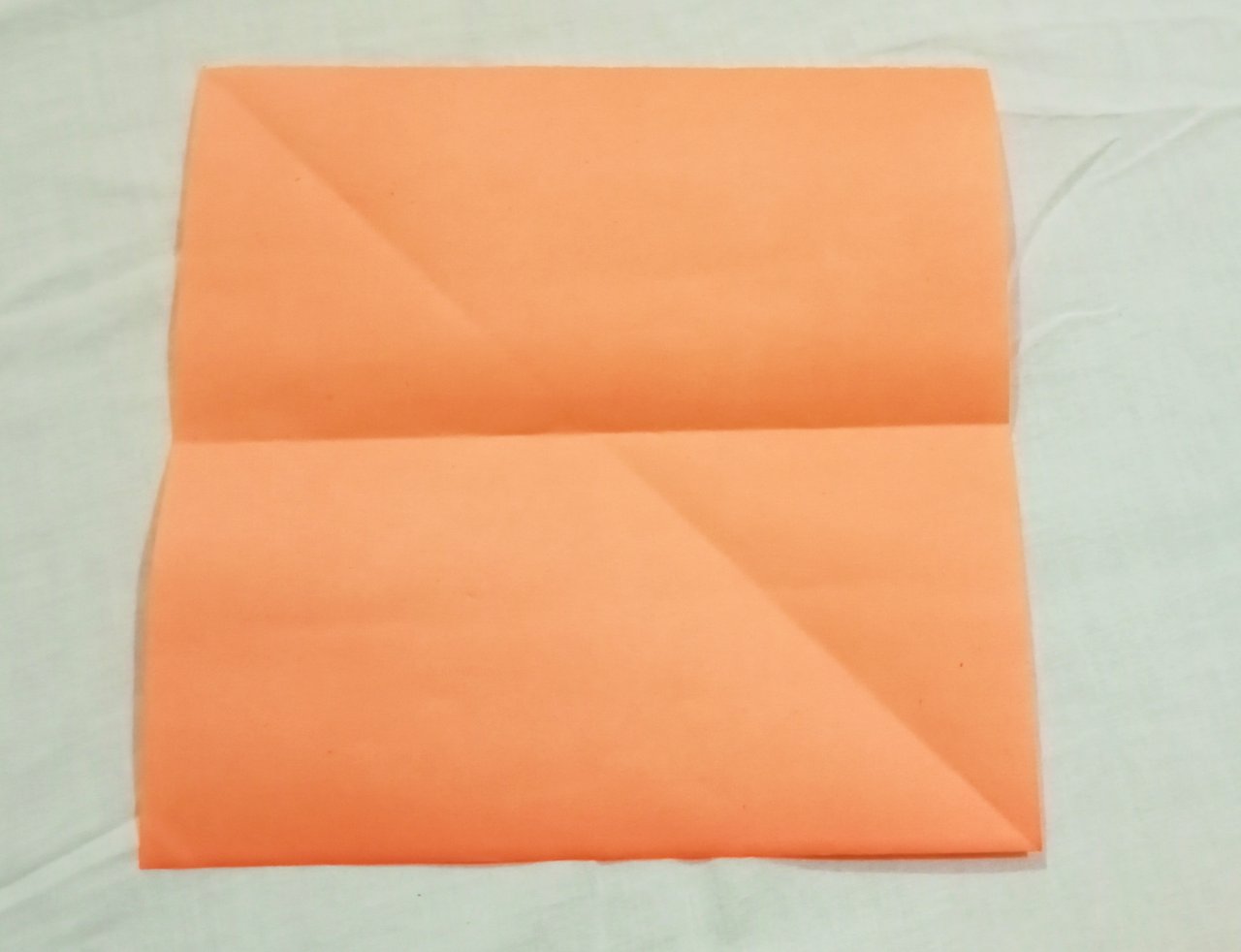 ৩। এবার ২০ × ২০ সেন্টিমিটারের কাগজটির মাঝ বরাবর একটি ভাঁজ দিতে হবে। তারপর রঙিন কাগজের দুই পাশে মাথা মাঝের ভাঁজ বরাবর, আরো দুটি ভাজ দিতে হবে।