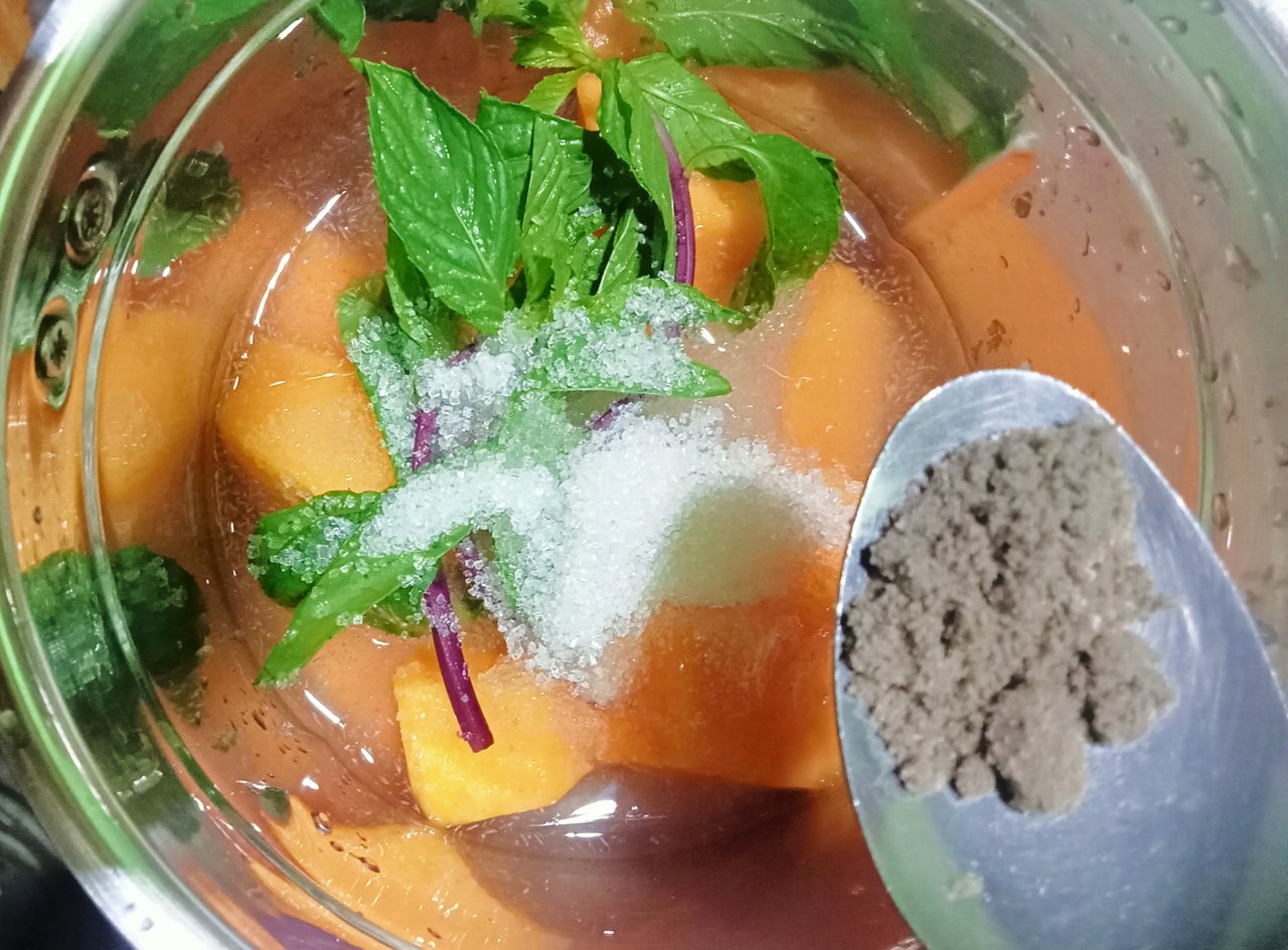 ১০। এবার পেঁপের টুকরো গুলো ঢেলে দেয়ার পর, কেটে বেছে পরিষ্কার করে নেয়া পুদিনা পাতাগুলো বেলেন্ডারে ঢেলে দিতে হবে।
