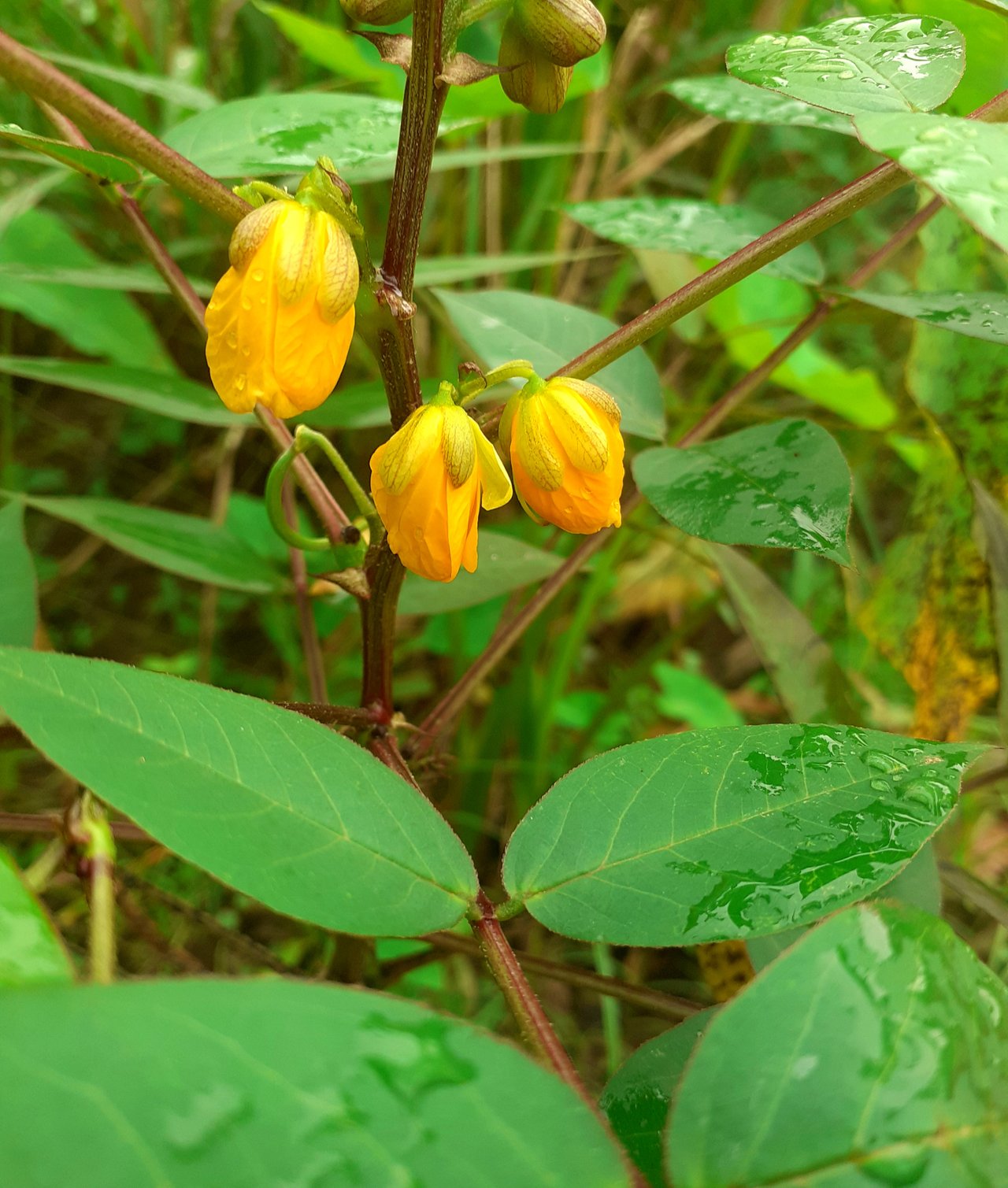 ফুল বাগানের পাশেই জঙ্গলের মধ্যে এই কাজটি লক্ষ্য করলাম। গাছটির মধ্যে খুব চমৎকার কয়েকটি হলুদ রঙের ফুল ফুটে আছে। অর্ধ ফোটা ফুলগুলো দেখে আমার কাছে খুব ভালো লাগলো। ভোরবেলা কিছুটা বৃষ্টি হয়েছিল সে বৃষ্টির কিছু ফটো গাছের মধ্যে তখনও লেগে ছিল অসাধারণ লাগলো দেখতে।
