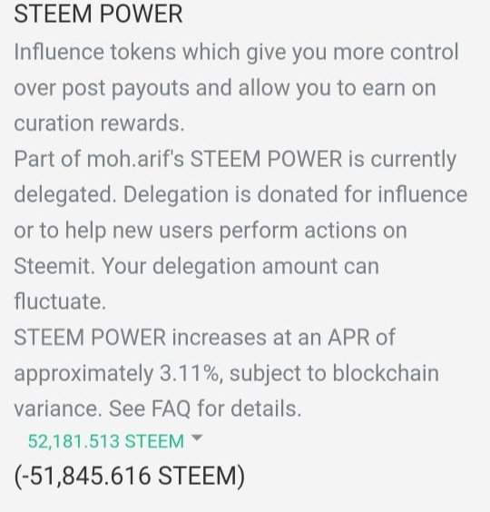 আমার একাউন্টে পাওয়ার আপ করার আগে এসপির পরিমাণ ছিল ৫২,১৮১। আজ ১৫ স্টিম পাওয়ার আপ করার পর একাউন্টের বর্তমানে মোট এসপির পরিমাণ হচ্ছে ৫২১৯৬। আমার টার্গেট ডিসেম্বর মাসের মধ্যে ৫৬,৫০০ এসপি করার আর সে লক্ষ্য পুরন করতে আমার এখনো ৪৩০৪ এসপি বাকি আছে। আমি আশাবাদী সময়ের মধ্যে আমি আমার টার্গেট পূরণ করতে সক্ষম হব।