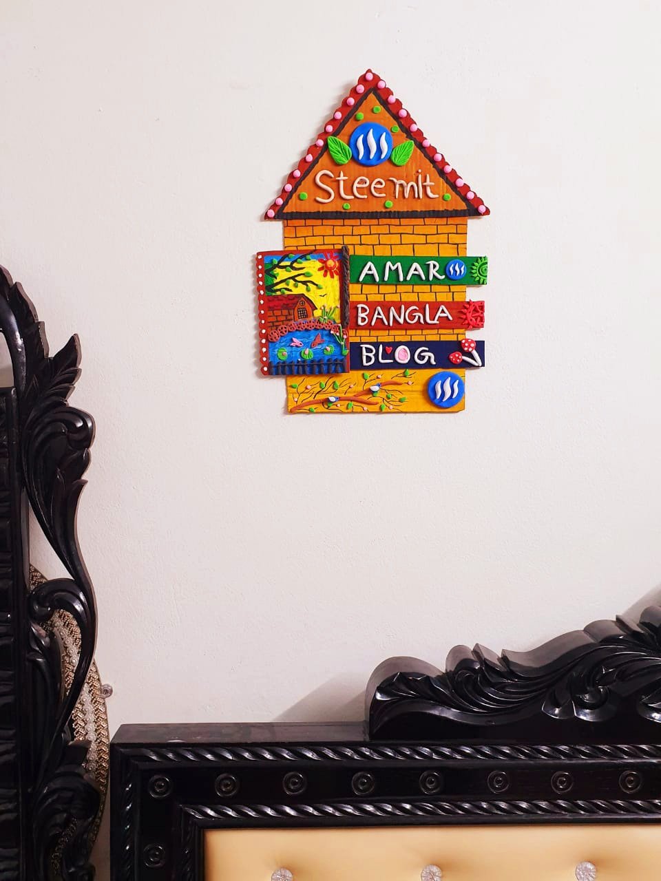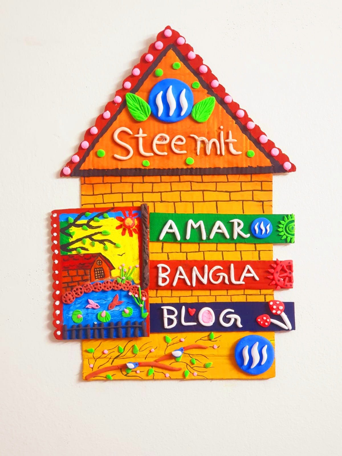 এই ওয়ালমেটটি তৈরি করতে প্রায় ৫ ঘন্টা সময় লেগেছে। ক্লে দিয়ে ইংরেজিতে স্টিমিট লিখেছি ওয়ালমেট এর উপরের অংশে। তাছাড়া ক্লে দিয়ে স্টিমিট প্লাটফর্মের তিনটি লোগো তৈরি করে, ওয়ালমেটের উপরে, মাঝখানে এবং নিচের অংশে লাগিয়ে দিয়েছি। তাছাড়া ওয়ালমেটের মাঝখানে ইংরেজিতে আমার বাংলা ব্লগ লিখেছি ক্লে দিয়ে। ছোট একটি কার্ডবোর্ডের মধ্যে একটি বাড়ি সহ প্রাকৃতিক দৃশ্য ফুটিয়ে তোলার চেষ্টা করেছি। এই ওয়ালমেটটি তৈরি করার পর আমার কাছে এতটাই ভাল লেগেছে যে, আমি সাথে সাথেই আমার রুমের দেয়ালে আঠা দিয়ে লাগিয়ে রেখেছি। এতে করে আমার রুমের সৌন্দর্য অনেকাংশে বৃদ্ধি পেয়েছে। যাইহোক ধাপে ধাপে আমি স্টিমিট লোগো সম্বলিত এবিবি ওয়ালমেট তৈরির সম্পূর্ণ প্রক্রিয়া আপনাদের সাথে শেয়ার করতে যাচ্ছি। আশা করি আপনাদের কাছে খুব ভালো লাগবে। আপনারা চাইলে এমন ওয়ালমেট তৈরি করে, দেয়ালে লাগিয়ে রুমের সৌন্দর্য বৃদ্ধি করতে পারেন।