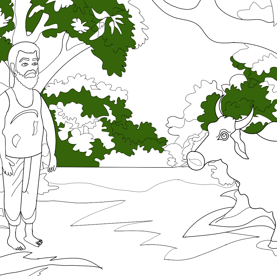 এরপর গাড় সবুজ দিয়ে পাতাগুলো ভরাট করতে লাগলাম, বা কালার করতে লাগলাম। এরপর আবার হালকা সবুজ সিলেক্ট করে আরো কিছু পাতা কালার করে নিলাম। এরপর শাখা-প্রশাখা গাছের কালারে পরিণত করলাম, এবং গরুটিকে কালার করে নিলাম।