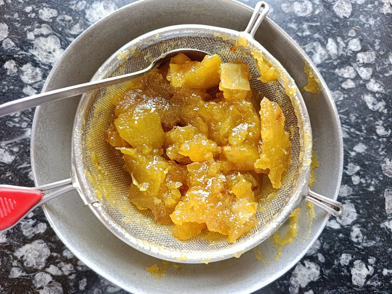 ঠান্ডা হয়ে গেলে একটি ঝাজরি তে করে ঘষে ঘষে জ্যামটা বের করে নিলাম। জ্যামএর মধ্যে কোন দলা বা আমের শক্ত কোন অংশ থাকলে ঝাজরিতে আলাদা হয়ে আসবে। সম্পূর্ণ জ্যামটা ভালো করে ঘষে ঘষে আলাদা করে নিলাম। এ পর্যায়ে বেরিয়ে এলো একদম স্বচ্ছ সুন্দর স্বাস্থ্যকর কাঁচা আমের জাম। এবার এই জ্যামটি প্রস্তুত হয়ে গেল খাওয়ার জন্য। এইভাবে আমের জ্যাম তৈরি করে একবার খেলে বারবার খেতে ইচ্ছা করবে। পাকা আম এবং কাঁচা আম দু প্রকার আম দিয়ে এই জ্যাম তৈরি করা যায়। তবে পাকা আম দিয়ে তৈরি করা জ্যাম মিষ্টি হয়ে থাকে এবং কাঁচা আম দিয়ে তৈরি করা জ্যাম একটু টক মিষ্টি খেতে হয়ে থাকে। খুবই সুস্বাদু এবং লোভনীয় এই আমের জ্যাম।