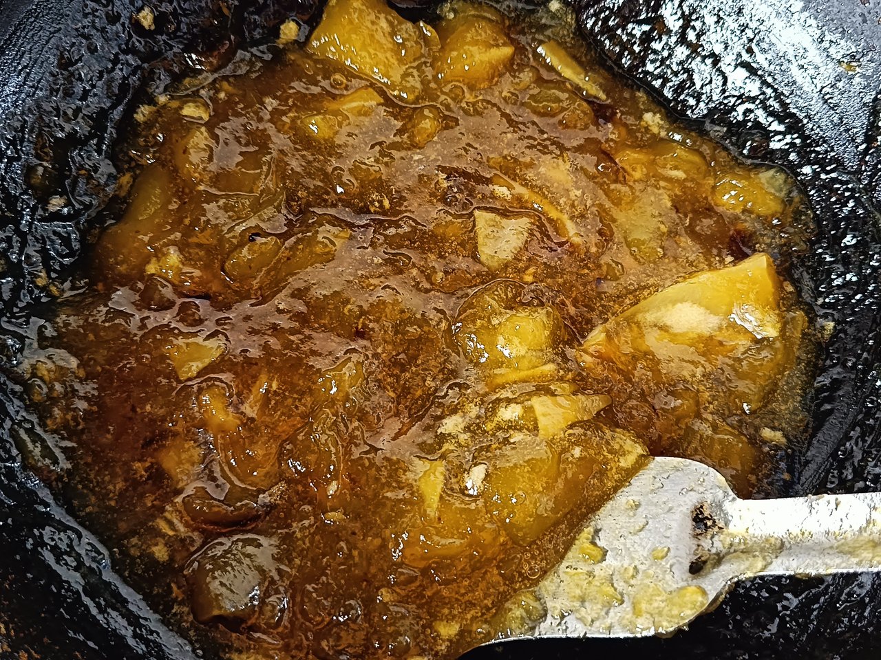 ওভেনে বসিয়ে দিলাম সেদ্ধ হওয়ার জন্য এবং একটা ঢাকনা দিয়ে ঢাকা দিয়ে দিলাম যেন অল্প জলেই সুন্দর করে সেদ্ধ হতে পারে। বেশ কিছুক্ষণ বাদে আম ভালো করে সেদ্ধ হয়ে গেলে ওভেনের ওপরে একটি কড়াই নিয়ে নিলাম ওই কড়াইতে সেদ্ধ করা আম টুকরোগুলো দিয়ে দিলাম। এবার দিয়ে দিলাম প্রায় ৫০০ অর্থাৎ অর্ধেক কেজি চিনি। এক কাপ মত জল দিয়ে দিলাম যেন কড়াইয়ের নিচে পুড়ে না যায় এবং চিনিটা গলে যায় ভালোভাবে। এ পর্যায়ে আম এবং চিনি ভালো করে মিশিয়ে কিছুক্ষণ নাড়াতে থাকলাম। কিছুক্ষণ পরেই চিনি গলে পুরো জলের আকার ধারণ করেছে। এপর্যায়ে দিয়ে দিলাম দুটো ছোট আকারের এলাচ। তারপর বেশ কিছুক্ষণ জাল দিতে দিতে প্রায় জল সব শুকিয়ে এলো এবং আমটা ঘনঘন হয়ে আসলো। কড়াই থেকে নামিয়ে কিছুক্ষণের জন্য ঠান্ডা করে নিলাম।
