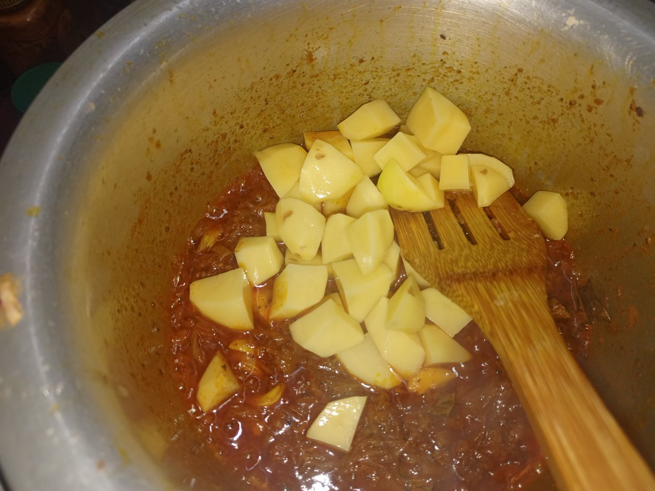 আলু গুলো দেওয়ার পর সব গুলো মিক্স করে হালকা করে কষিয়ে নিতে হবে।কষিয়ে নেওয়ার পর মাংস গুলো দিতে হবে। দেওয়ার পর মাংস গুলো সুন্দর করে মিক্স করতে হবে।