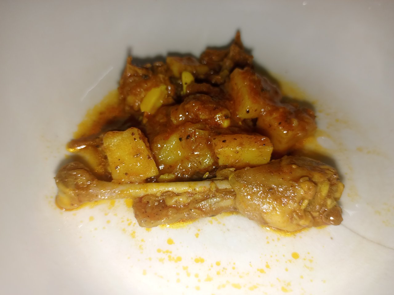 তো হালকা পানি দিয়ে আবার ঢাকনা দিয়ে ঢেকে নিলাম। বেশ কিছুক্ষণ পর ঢাকনা খুলে মাংস গুলো নাড়াচাড়া করে নিলাম। তো দেখতেছি মাংস গুলো সিদ্ধ হয়ে গেছে। রান্না এখানেই শেষ। এবার তাহলে পরিবেশন দেখা যাক।