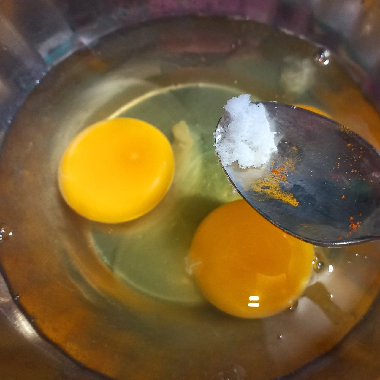 প্রথম ধাপে ৩ টি ডিম একটি বাটিতে ভেঙ্গে নিব।ডিম গুলো ভাঙ্গা হলে, এবার আমি অল্প অল্প করে হলুদ গুঁড়া,জিরা,ধনিয়া গুঁড়া এবং স্বাদমতো লবণ দিয়ে কাঁটা চামচের সাহায্যে ফেটিয়ে নিব এভাবে।