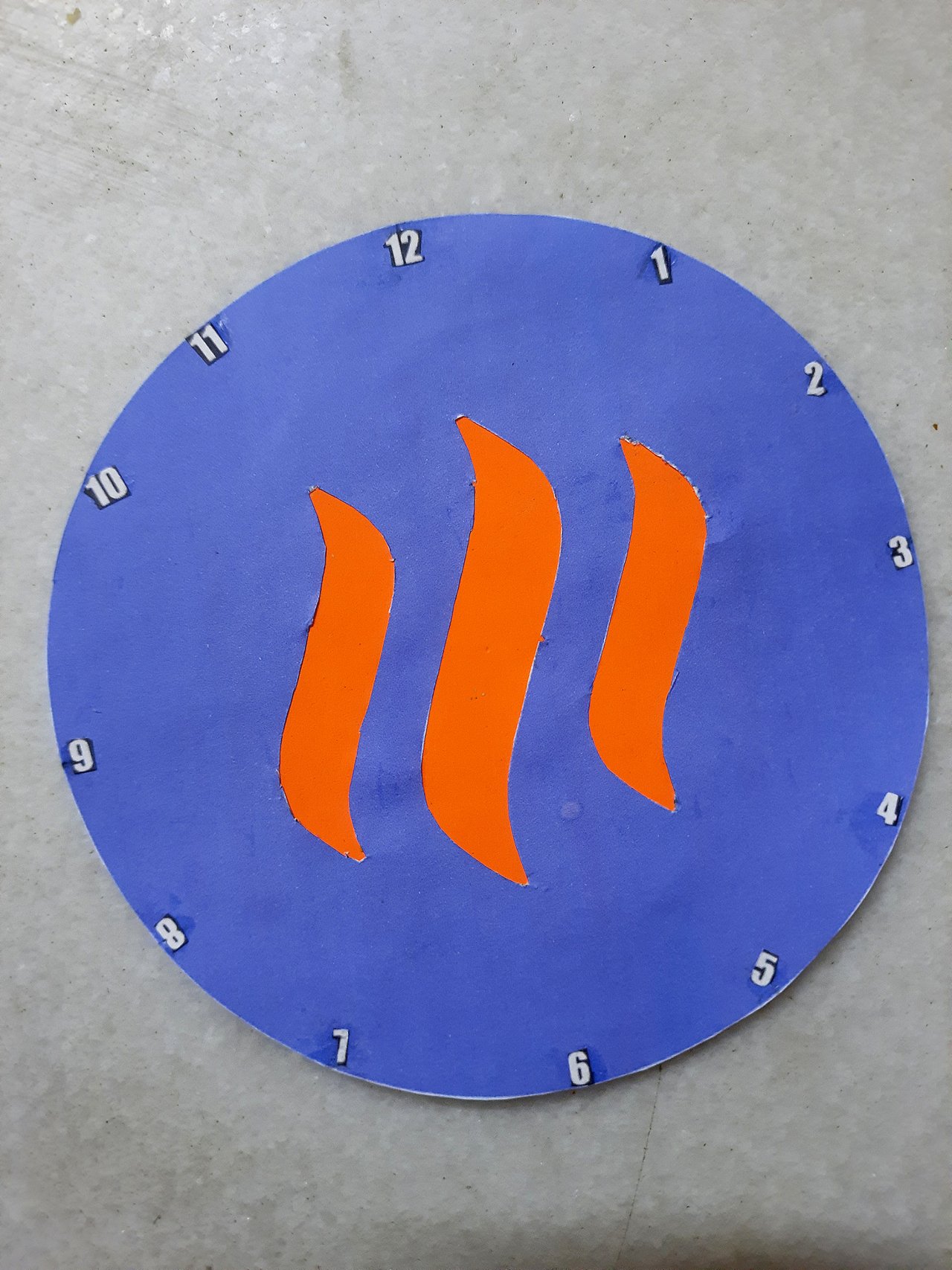 যেহেতু টেবিল ঘড়ি তৈরি করব সেই জন্য প্রথমে ঘড়ির ডায়াল তৈরি করার জন্য এক টুকরো রঙিন কাগজকের উপর কম্পাস এবং পেন্সিলের সাহায্যে বৃত্ত অংকন করে নিলাম এবং তা পরে কাঁচির সাহায্যে কেটে নিলাম। গোল করে কেটে রাখা রঙিন কাগজের ভিতরে পেন্সিলের সাহায্যে স্টিম কয়েনের লোগো এঁকে নিলাম এবং তা কাঁচির সাহায্যে কেটে নিলাম যেমনটা তোমরা চিত্রে দেখতে পাচ্ছ।