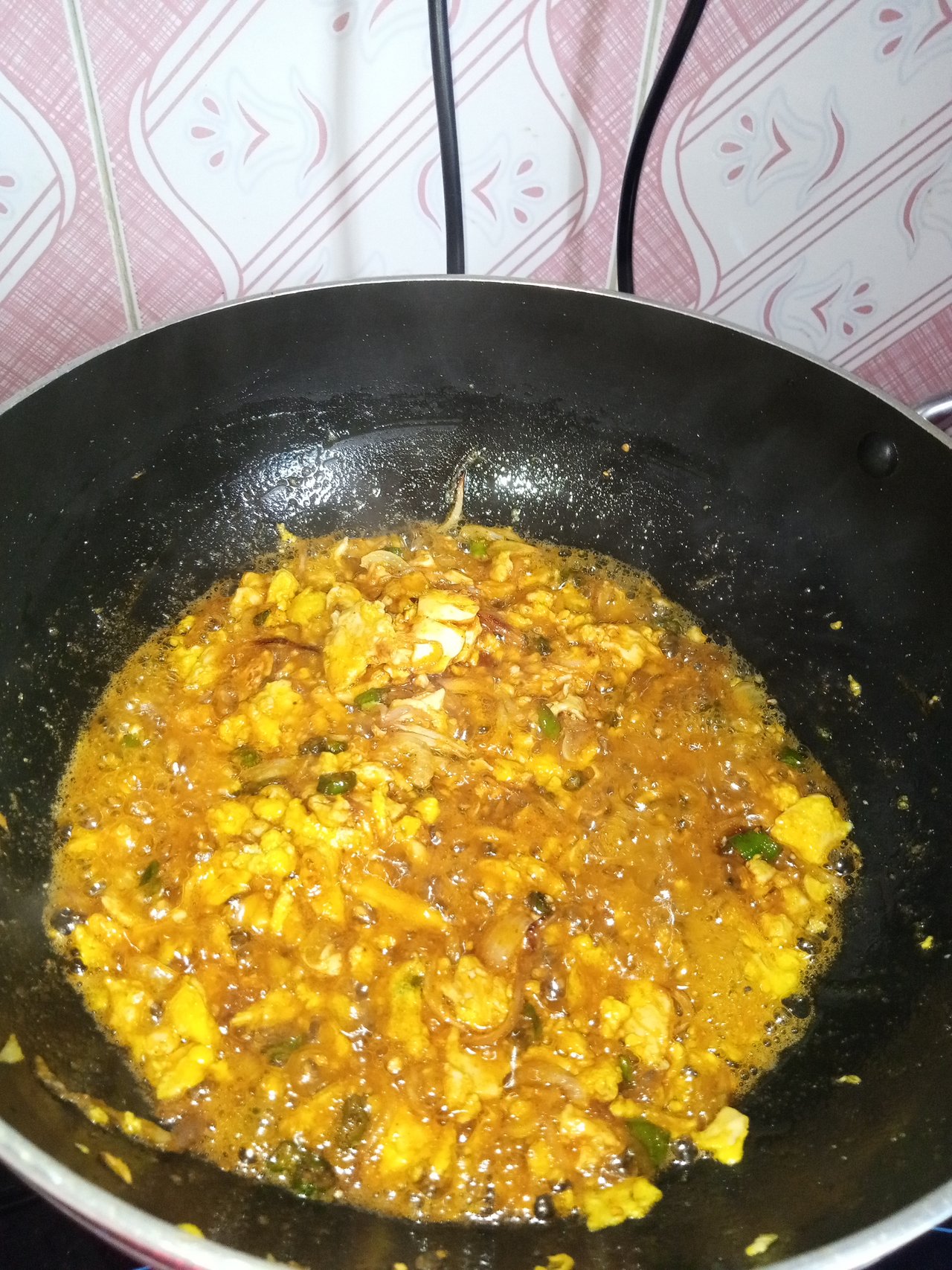 ডিম দুটো ভেঙে কড়াই এ দিয়েছি। তারপর ভালোভাবে নেড়েচেড়ে ফাটিয়ে পেয়াজ মরিচ এর সাথে মিশিয়ে নিয়েছি।