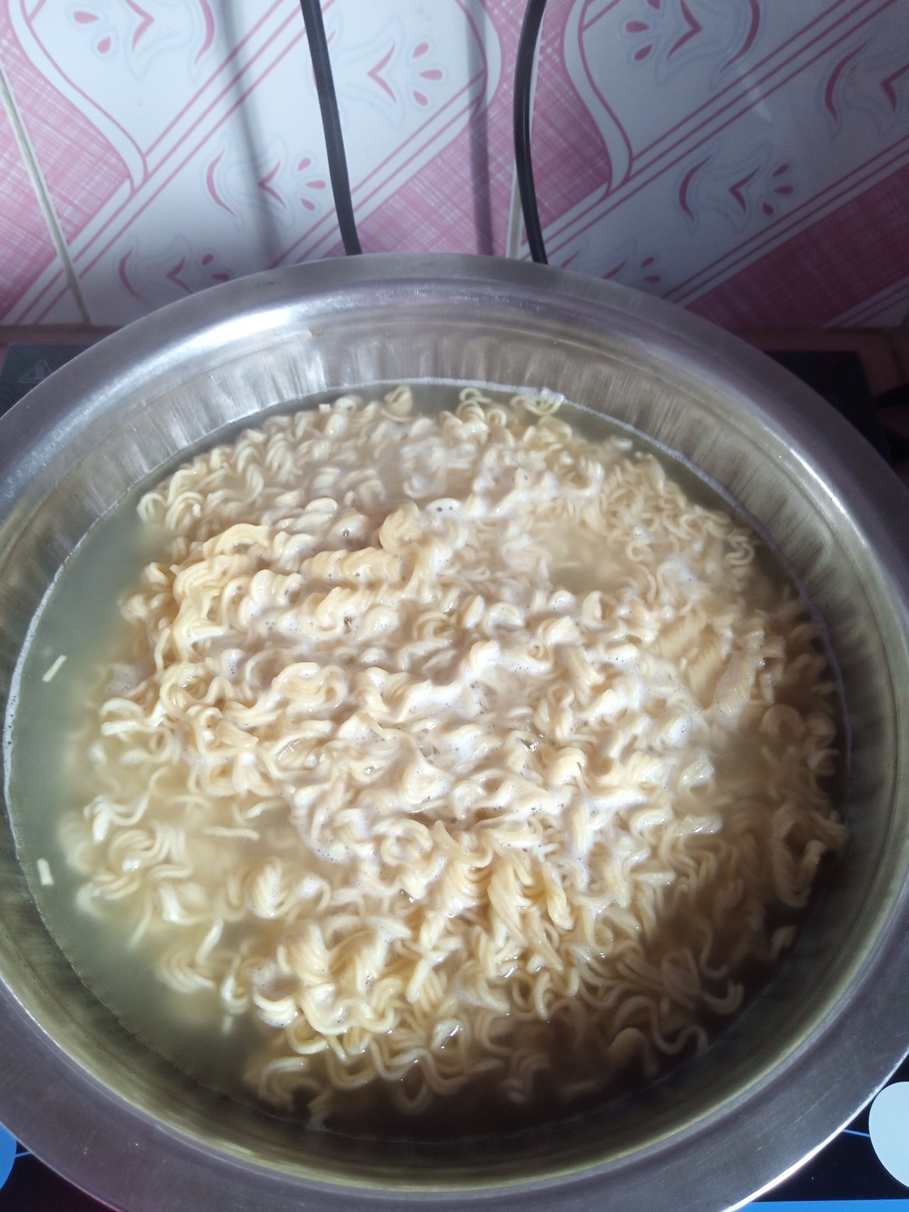 চুলায় একটি পাত্রে পানি দিয়েছি। পানিতে পরিমাণ মত লবন দিয়ে পানি গরম করে নিয়েছি।পানি গরম হয়ে আসলে নুডলস গুলো পানিতে সেদ্ধ হওয়ার জন্য দিয়েছি।