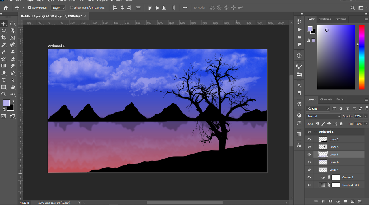 পাহাড় এবং মেঘের একটা প্রতিচ্ছবি দেখা যাচ্ছে পানিতে এমন একটা ইফেক্ট তৈরি করলাম।