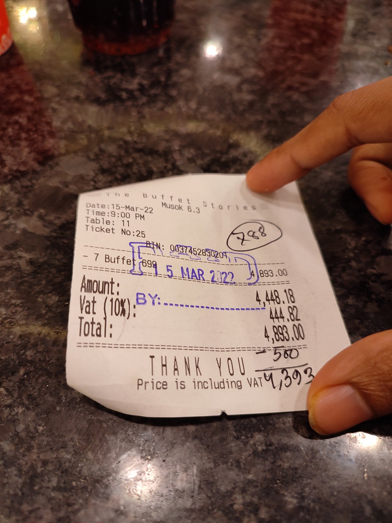 আমাদের একটু তাড়া আছে, বাসায় যেতে হবে তাই আমরা একদম শেষ পর্যন্ত থাকলাম না। সময় শেষ হওয়ার আধা ঘন্টা আগেই বের হয়ে যাবো, তাই আমাদের বিল দিতে বললাম। আমাদের দুই মিনিট অপেক্ষা করতে হলো তারপর আমাদের বিল চলে আসলো। আমরা বিল এবং টিপস্ দিয়ে আস্তে আস্তে বিদায় নেওয়া শুরু করলাম।