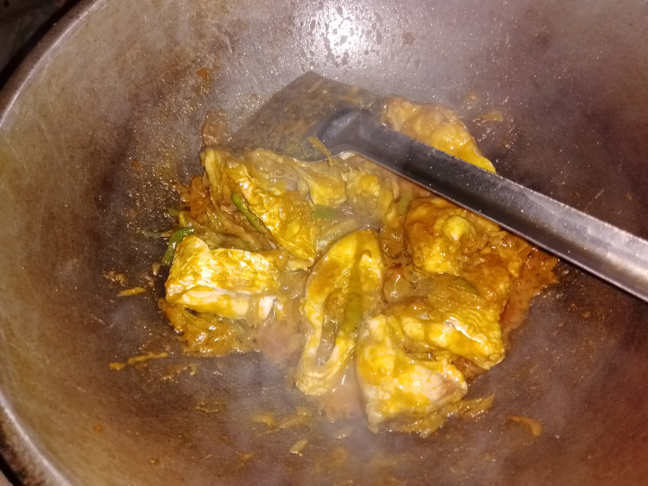 মসলা ভালোভাবে কষানোর পর মাছ দিয়ে দেবো কড়াইয়ের মধ্যে। তারপর মাছ খুব ভালোভাবে কষাতে হবে। মাছ কষানো হয়ে গেলে অন্য একটা পাত্রে মাছগুলো উঠিয়ে রাখবো তার পরে অবশিষ্ট কষানো মসলার মধ্যে এবার বেগুন এবং বরবটি দিয়ে দেব। বেগুন এবং বরবটি কষাতে হবে।