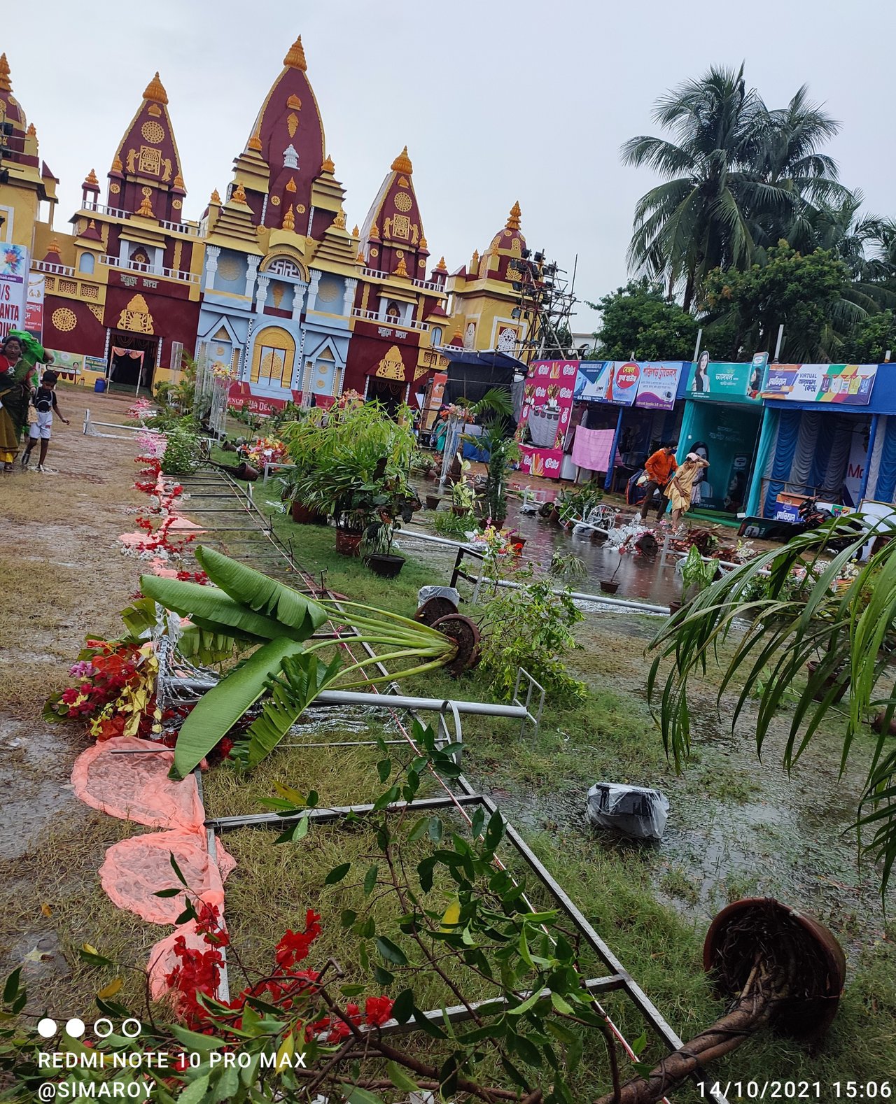 বুদ্ধ বিহার থিমটি দেখে যখন টোটো করে যাচ্ছি ওই মুহূর্তে ঝড় বৃষ্টি শুরু হয়ে গেছে। প্রচণ্ড বৃষ্টি হচ্ছে। তাও টোটো ড্রাইভার টোটো নিয়ে সবুজ সংঘের পাশে নামিয়ে দেয়। সেখানে 1 ঘন্টা আমরা দাঁড়িয়ে থাকি। তারপর বৃষ্টি থেমে গেলে পূজা দেখতে যায় । কিন্তু দুঃখের বিষয় এই যে প্রাকৃতিক দুর্যোগের কারণে তখন কারেন্ট ছিলো না। যখন আমরা সবুজ সংঘ ক্লাবের পূজা দেখতে যায়। তখন প্যান্ডেলের মধ্যে অন্ধকার। মাকে ভালোভাবে দর্শন করতে পারে নি। তবে অন্ধকার অবস্থায় একটা ছবি তুলেছিলাম।
