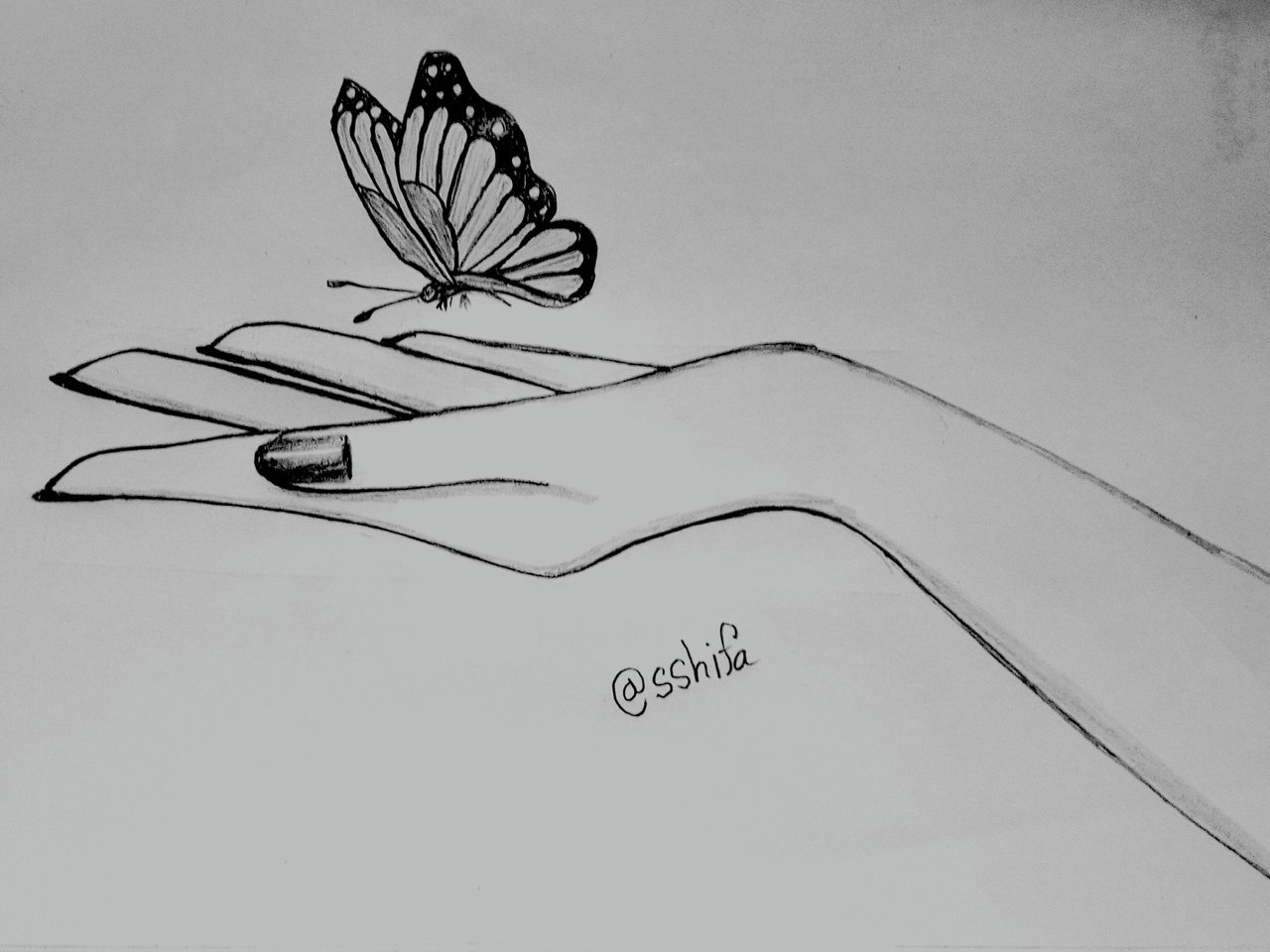 - একটি হাতের উপর প্রজাপতি উড়ার খুব সুন্দর একটি চিত্রাংকন। এই চিত্রাংকন টি করার পর আমার কাছে খুবই ভালো লেগেছে। আসলে পেন্সিল আর্টগুলো আমার সব সময় খুব পছন্দ তাই আমি বেশিরভাগ সময় পেন্সিল আর্ট করি।