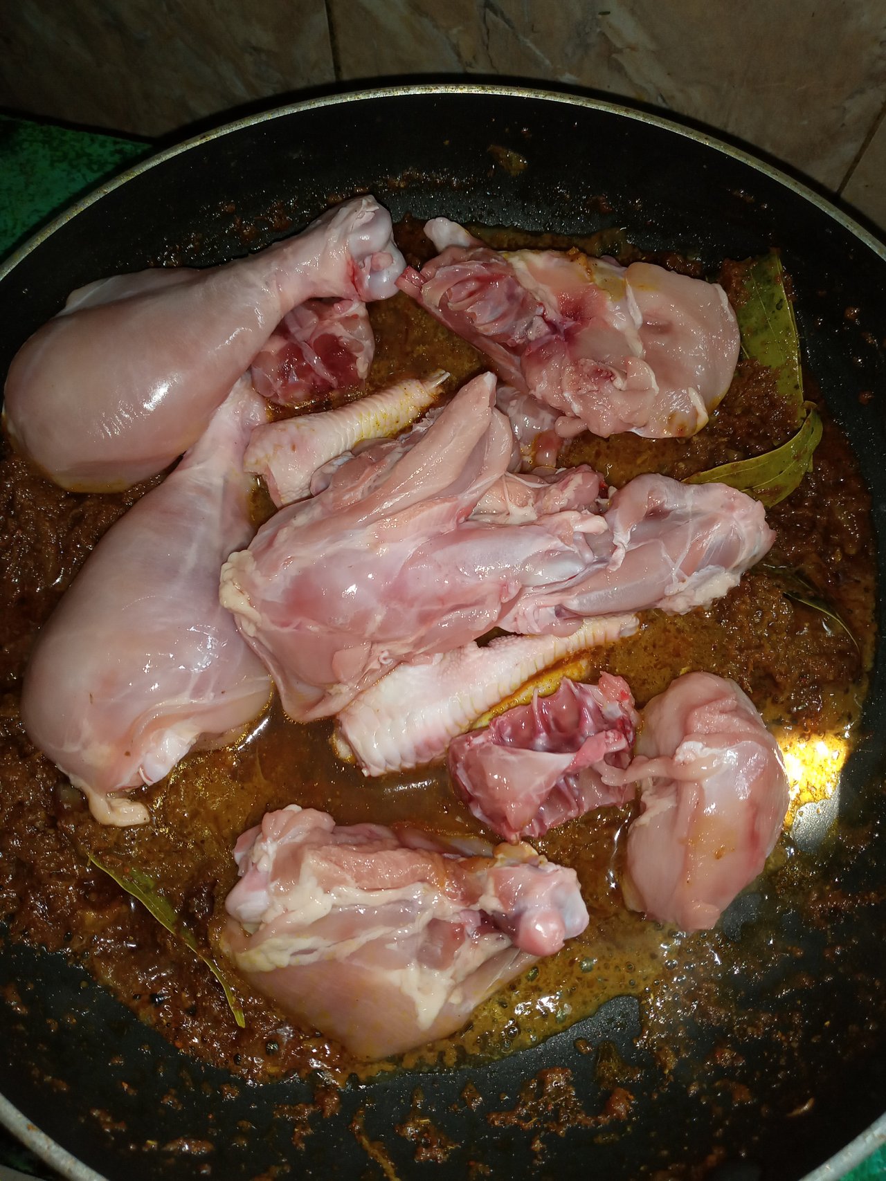 • তারপর মসলাটা কষানো হয়ে গেলে এর মধ্যে মুরগির মাংস গুলো দিয়ে ভালো করে নেড়ে চেড়ে ঢাকনা দিয়ে ঢেকে চুলার আঁচ কমিয়ে মুরগির মাংস টা কিছুক্ষণ কষিয়ে নিলাম।
