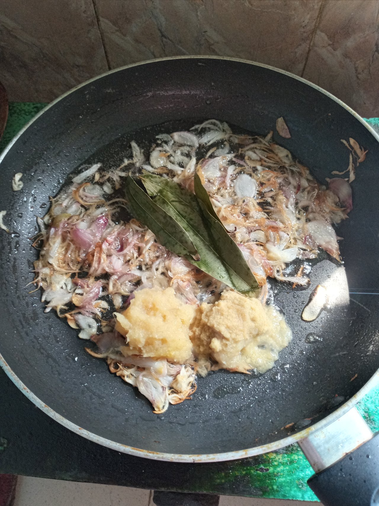 • তারপর পেঁয়াজগুলো ভাজা হয়ে গেলে এর মধ্যে পরিমাণমতো আদা বাটা, রসুন বাটা, ও তেজপাতা দিয়ে একটু ভাল করে ভেজে নিলাম। তারপর পরিমাণমতো হলুদের গুঁড়া, মরিচের গুঁড়া, জিরা গুঁড়া, গরম মসলা গুঁড়া,লবণ দিয়ে মসলাগুলো কিছুক্ষণ নেড়েচেড়ে কষিয়ে নিলাম।