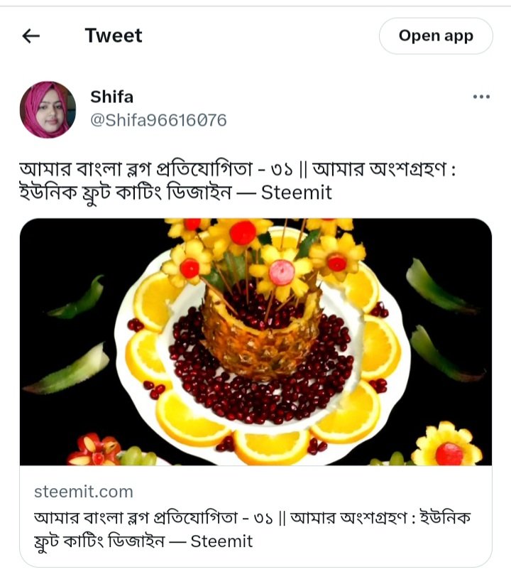 "আসসালামু আলাইকুম" সবাই কেমন আছেন? আশা করি আল্লাহর অশেষ রহমতে সবাই খুব ভালোই আছেন। আমিও আল্লাহর রহমতে ভালো আছি। আজকে আমি আমার বাংলা ব্লগ কমিউনিটির প্রতিযোগিতা - ৩১ শেয়ার করো তোমার ইউনিক ফ্রুট কাটিং ডিজাইন এই প্রতিযোগিতায় অংশগ্রহন করতে পেরে আমি খুবই আনন্দিত। আর আমি আমার বাংলা ব্লগ কমিউনিটির দাদা সহ সকল এডমিন মডারেটরদেরকে এবং @swagata21 দিদি কে ধন্যবাদ জানাতে চাই এতো সুন্দর একটি কনটেস্টের আয়োজন করার জন্য।