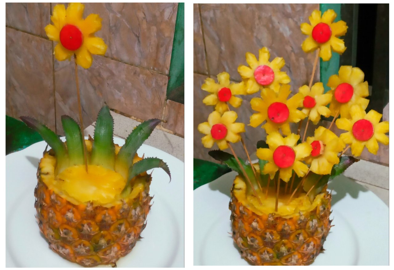 - এরপর গোল টুকরার ভেতর আনারস দিয়ে তৈরি করা ফুলের শালাগুলো সুন্দর করে ঢুকিয়ে দিলাম।