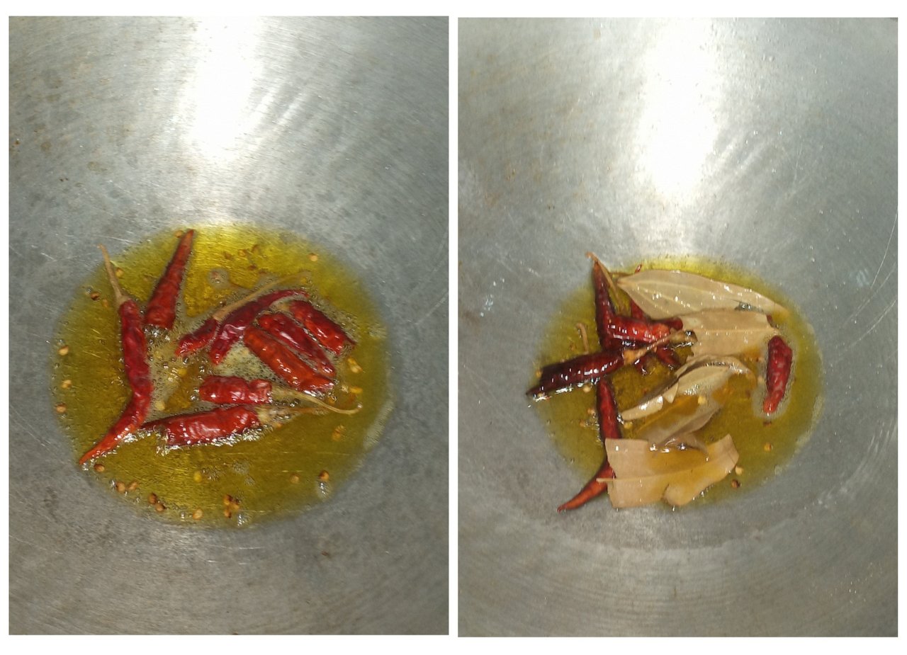- এরপর তেলের মধ্যে কয়েকটা শুকনো মরিচ ভেঙ্গে দিলাম এবং দুই তিনটা তেজপাতা দিয়ে দিলাম। তারপর এগুলো কিছুক্ষণ তেলের মধ্যে ভেজে নিলাম।