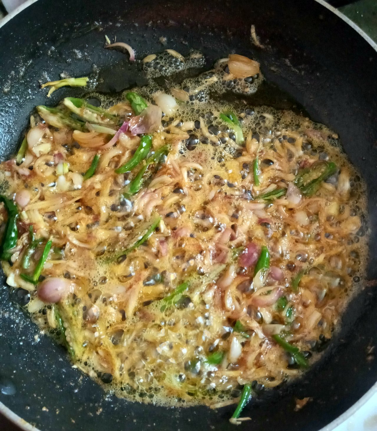 - এরপর চিংড়ি মাছ গুলো ওঠানোর পর ফ্রাইপেনে রয়ে যাওয়া বাকি তেলগুলোর মধ্যে আরো সামান্য একটু তেল দিয়ে তেলের মধ্যে পেঁয়াজ কুঁচি দিয়ে ভালো করে নেড়ে চেড়ে একটু ভেজে নিলাম।