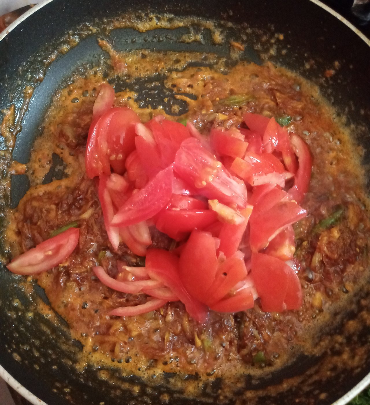 - তারপর মসলা কষানো হয়ে গেলে এরমধ্যে কেটে রাখা টমেটোগুলো দিয়ে একটু নেড়েচেড়ে ভেজে নিলাম।