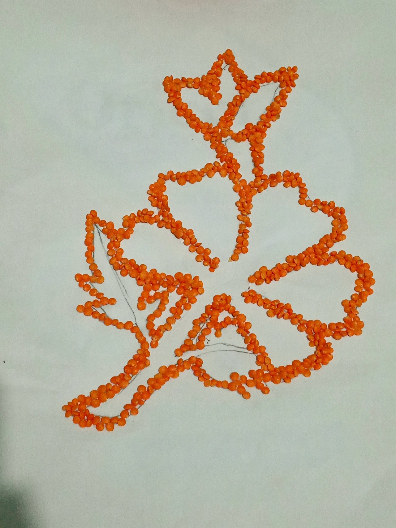 - এরপর আমি ফুলের কলি এবং পাতার মধ্যেও আঠা দিয়ে মসুরের ডাল গুলো লাগিয়ে নিলাম।