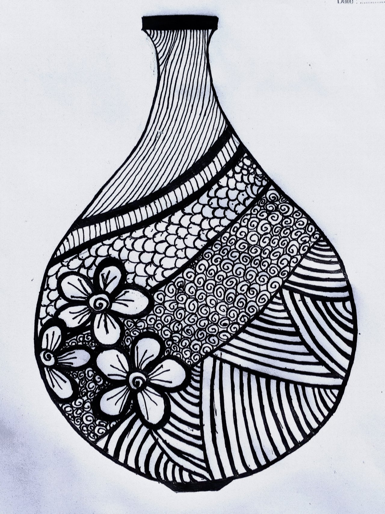 - এরপর পেন্সিল দিয়ে আর্ট করা শেষে পেন্সিলের দাগের উপর পুরো ফুলদানিটা কালো জেল পেন দিয়ে সুন্দর করে আর্ট করে নিলাম।