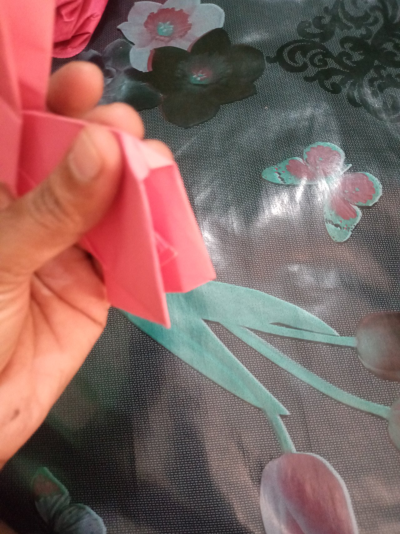 - এরপর আবার মাঝখানে দুই পাশ থেকে ভাজ দিয়ে নিলাম। এরপর কাগজটি নিচের অংশ ধরে দুটো কোনা করে চতুর্ভুজের মত করে নিলাম।