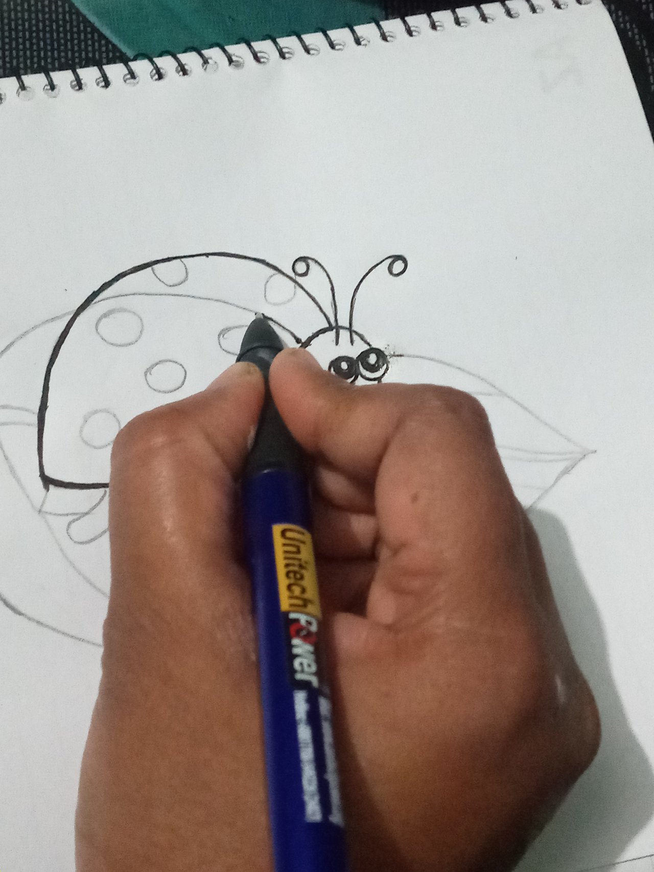 - এরপর আমি পেন্সিলের দাগের ওপর কালো জেল পেন দিয়ে পোকাটির মুখ,চোখ এবং শরীরের গোল দাগ গুলো কালো করে নিলাম। এবং শরীরের নিচের অংশ পুরো কালো করে নিলাম।