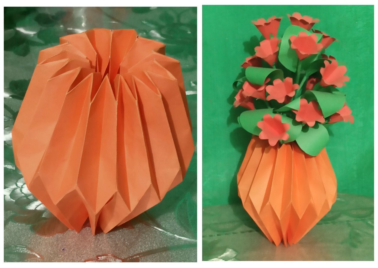 - রঙিন কাগজের ডিজাইন করা ফুল। এই এই কাগজের ফুলগুলো তৈরি করতে অনেকগুলো ভাজ দিতে হয়েছে। এই কাগজের ফুলগুলো তৈরি করতে খুব সাবধানতা অবলম্বন করতে হয় একটু বেশ কম হলেই পুরো ডিজাইন টা নষ্ট হয়ে যায়।