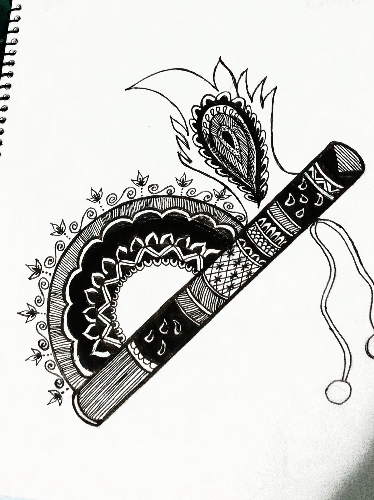 - এরপর পেন্সিলের দাগের উপর বাঁশিটা কাল জেল পেন দিয়ে আর্ট করে নিলাম। বাঁশীটির মধ্যে কিছু ডিজাইন করলাম।
