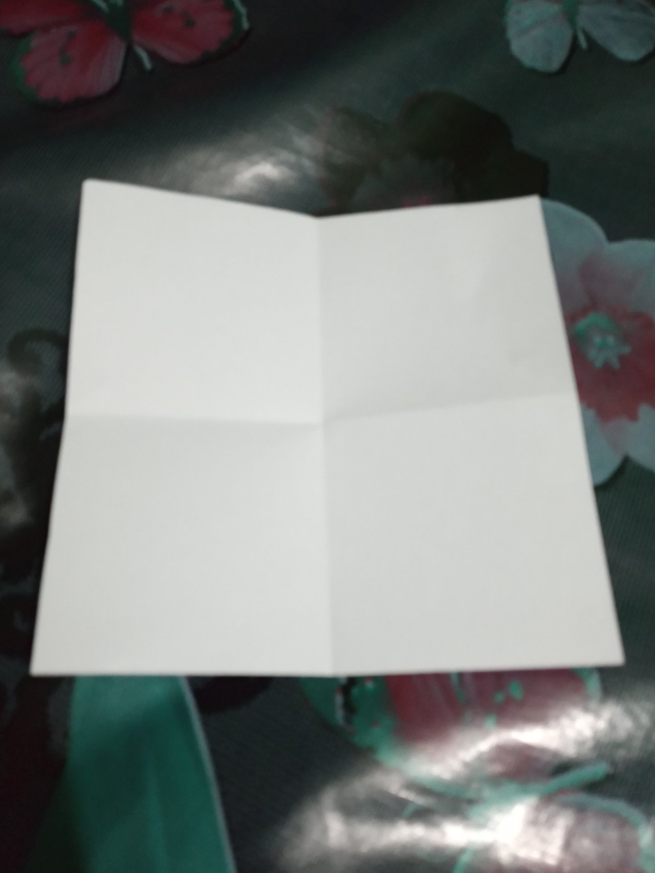 - প্রথমে আমি একটি সাদা কাগজ নেই তারপর স্কেল দিয়ে ১৫ ×১৫ সে.মি দাগ দিয়ে নিলাম। তারপর দাগ অনুযায়ী কাগজটি কেটে নিলাম। এরপর কাগজটির মাঝখান বরাবর ভাজ করে নিলাম। এরপর আবারো মাঝখান বরাবর ভাজ করে নিলাম।
