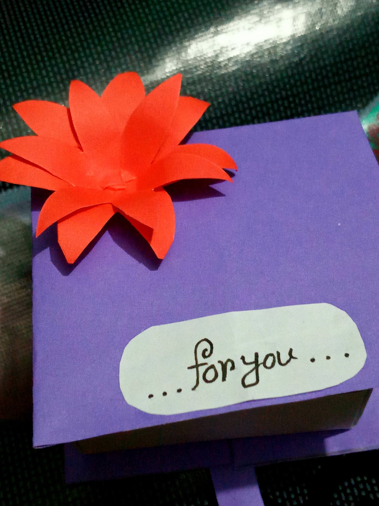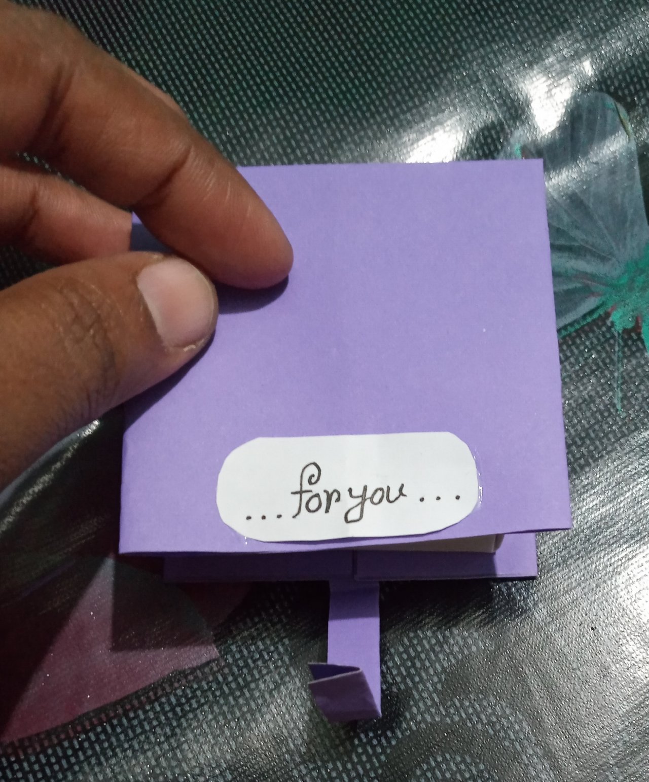 - এরপর একটি ছোট সাদা কাগজ নিয়ে দুইপাশ গোল করে কেটে নিলাম। তারপর কাগজটির উপরে For you লিখে কাগজটি বক্সের উপরে আঠা দিয়ে লাগিয়ে নিলাম। তারপর বেগুনি কালারের কাগজটি সাদা কাগজের ভিতরে ঢুকিয়ে বক্সটি মুখ বন্ধ করে দিলাম।