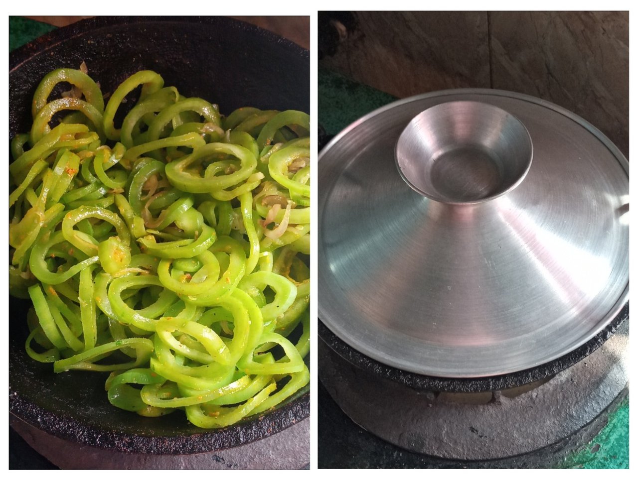 - পেঁয়াজ মরিচ গুলো ভাজা হয়ে গেলে এরমধ্যে কেটে রাখা চিচিঙ্গা গুলো দিয়ে দিলাম। এরপর এগুলোর উপরে পরিমাণমতো হলুদের গুঁড়া ও লবণ দিয়ে দিলাম।