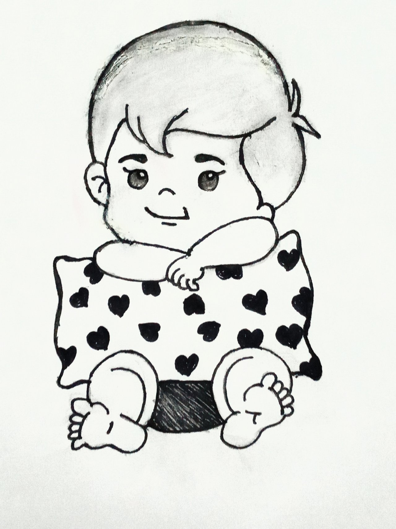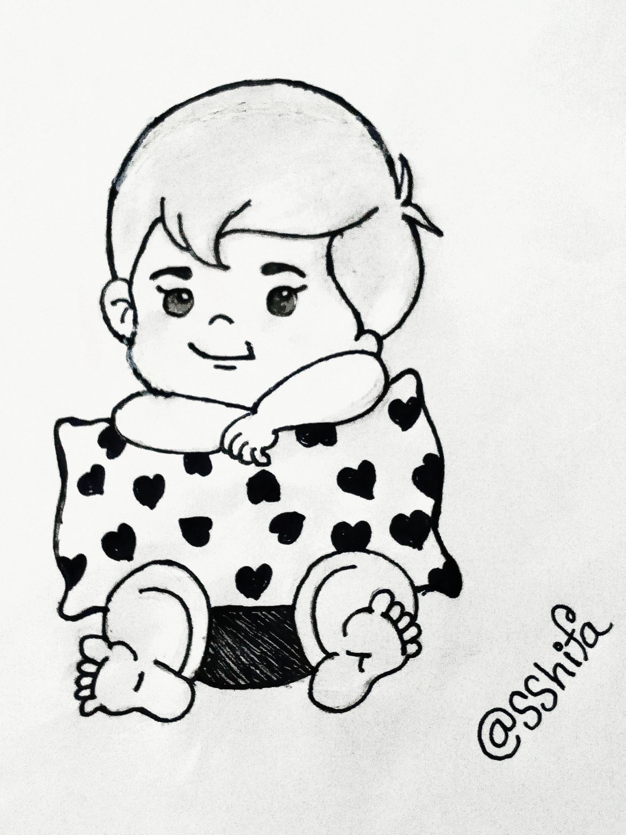 এরপর বেবিটার আরেকটি পা এবং বেবিটার পরনের প্যান্ট আর্ট করলাম। এবং পেন্সিল দিয়ে আঁকা শেষ করলাম।