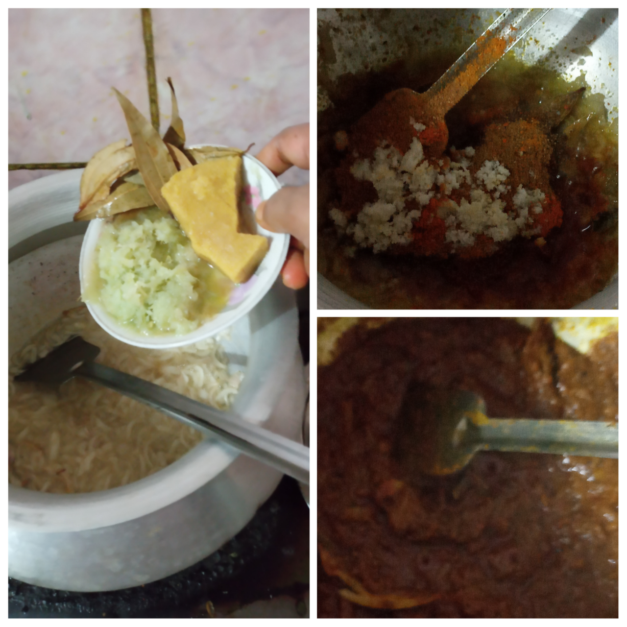 - এরপর পেঁয়াজ কুচি ভাজা হয়ে গেলে এরমধ্যে পরিমাণমতো তেজপাতা আদা বাটা এবং রসুন বাটা দিয়ে দিলাম তারপর একটু নেড়েচেড়ে এরমধ্যে পরিমাণ মত লবণ, হলুদের গুঁড়া, মরিচের গুঁড়া, জিরা গুড়া, গরম মসলা গুঁড়া এবং ধনিয়া গুড়া দিয়ে দিলাম। এবং সামান্য একটু পানি দিয়ে মশাগুলো কিছুক্ষণ কষিয়ে নিলাম।