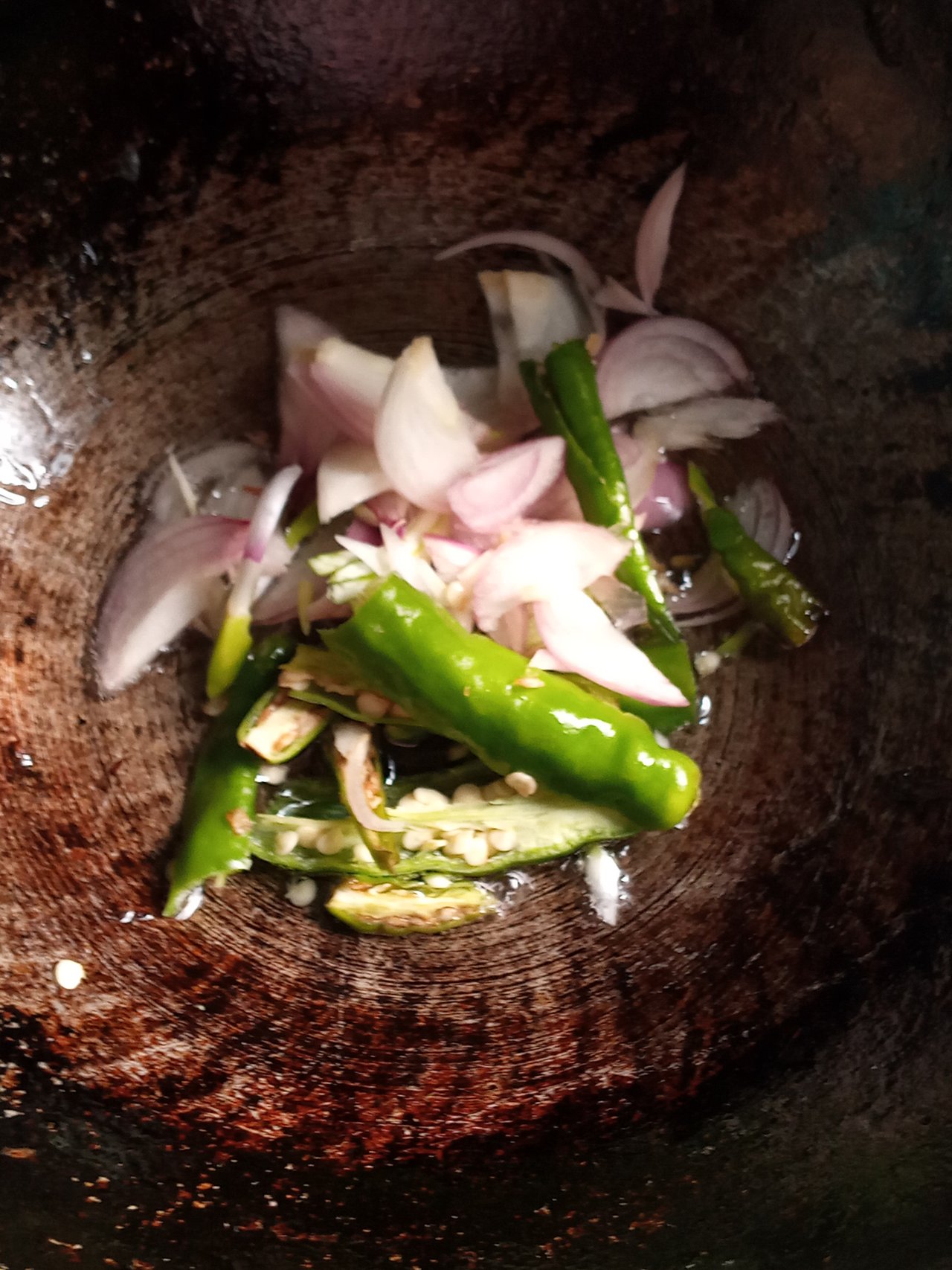 - প্রথমে আমি চুলার মধ্যে একটি কড়াই বসালাম। কড়াই এর মধ্যে পরিমানমত তেল দিয়ে দিলাম। তারপর এরমধ্যে পেঁয়াজ কাঁচামরিচ গুলো দিয়ে একটু ভেজে নিলাম।
