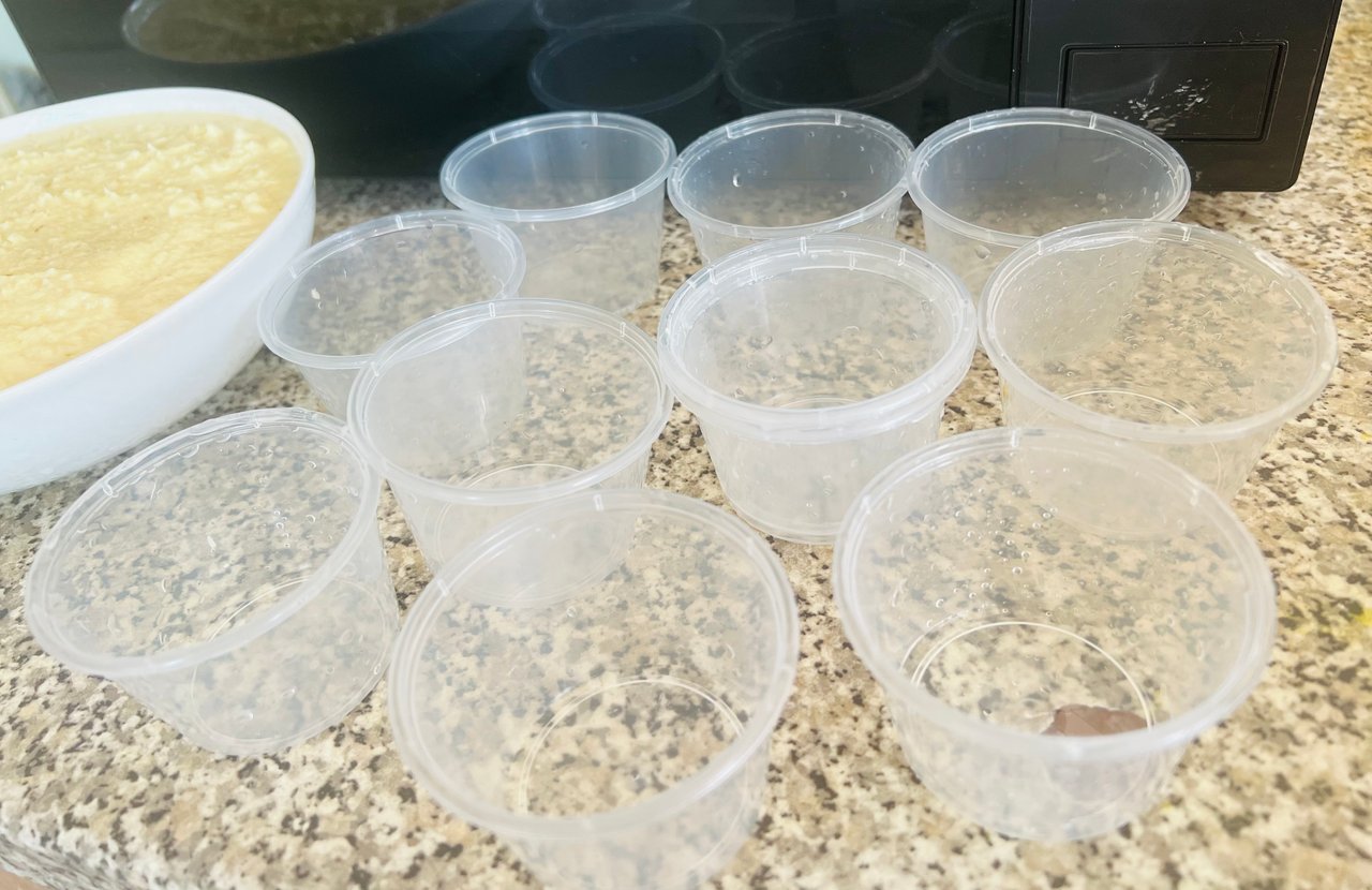 এরপর চাঁটনি কাপগুলোতে যতটুকু একবার রান্নার জন্য লাগবে সেই অনুপাতে ঢেলে নিয়েছি।