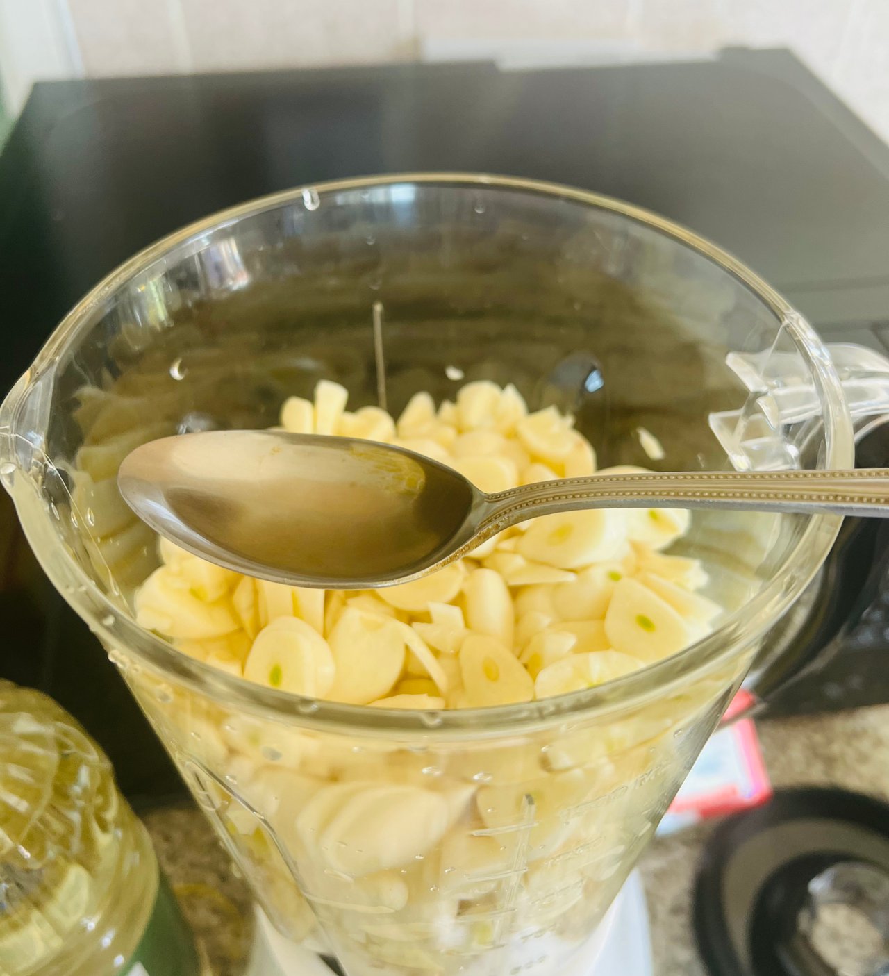 এরপর ব্লেন্ডারে আদা, রসুন ও পানি দিয়ে তেল যোগ করে দিয়েছি।