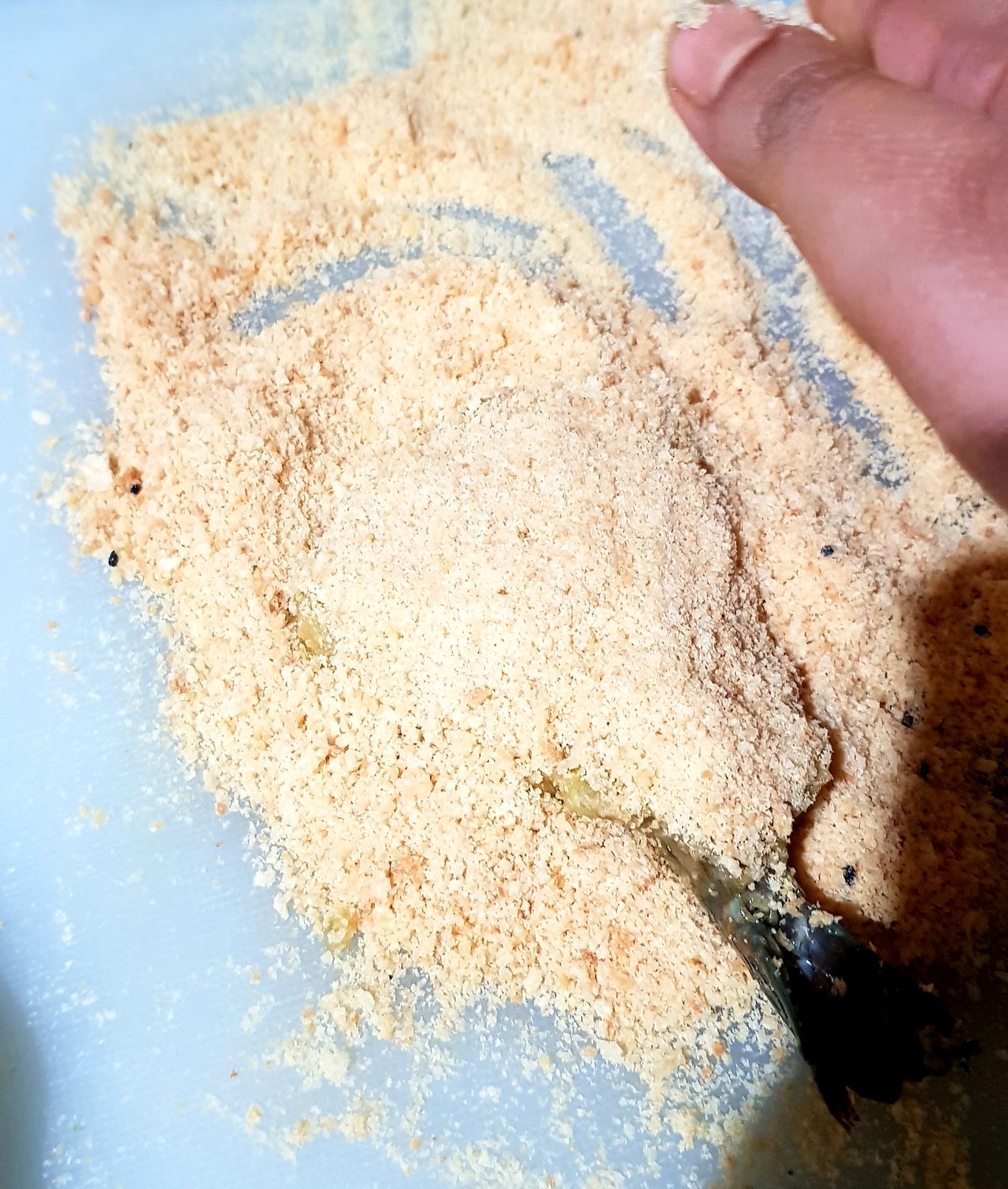 এরপর একটা বাটিতে দুটো ডিম ভেঙ্গে নিয়ে লবণ দিয়ে কাঁটা চামচ দিয়ে ভালো মতো ডিমটা ফেটিয়ে নিয়েছি। তারপর মেরিনেট হওয়া চিংড়ি মাছ গুলো একটা একটা করে নিয়ে ব্রেডক্রাম্বে গড়িয়ে নিয়েছি। একেবারে হাত দিয়ে চেপে চেপে ব্রেডক্রাম্বে চিংড়ি গুলো গড়াতে হবে। ছবিতে যেরকম ভাবে দেখানো হয়েছে ঠিক সেই রকম হবে।