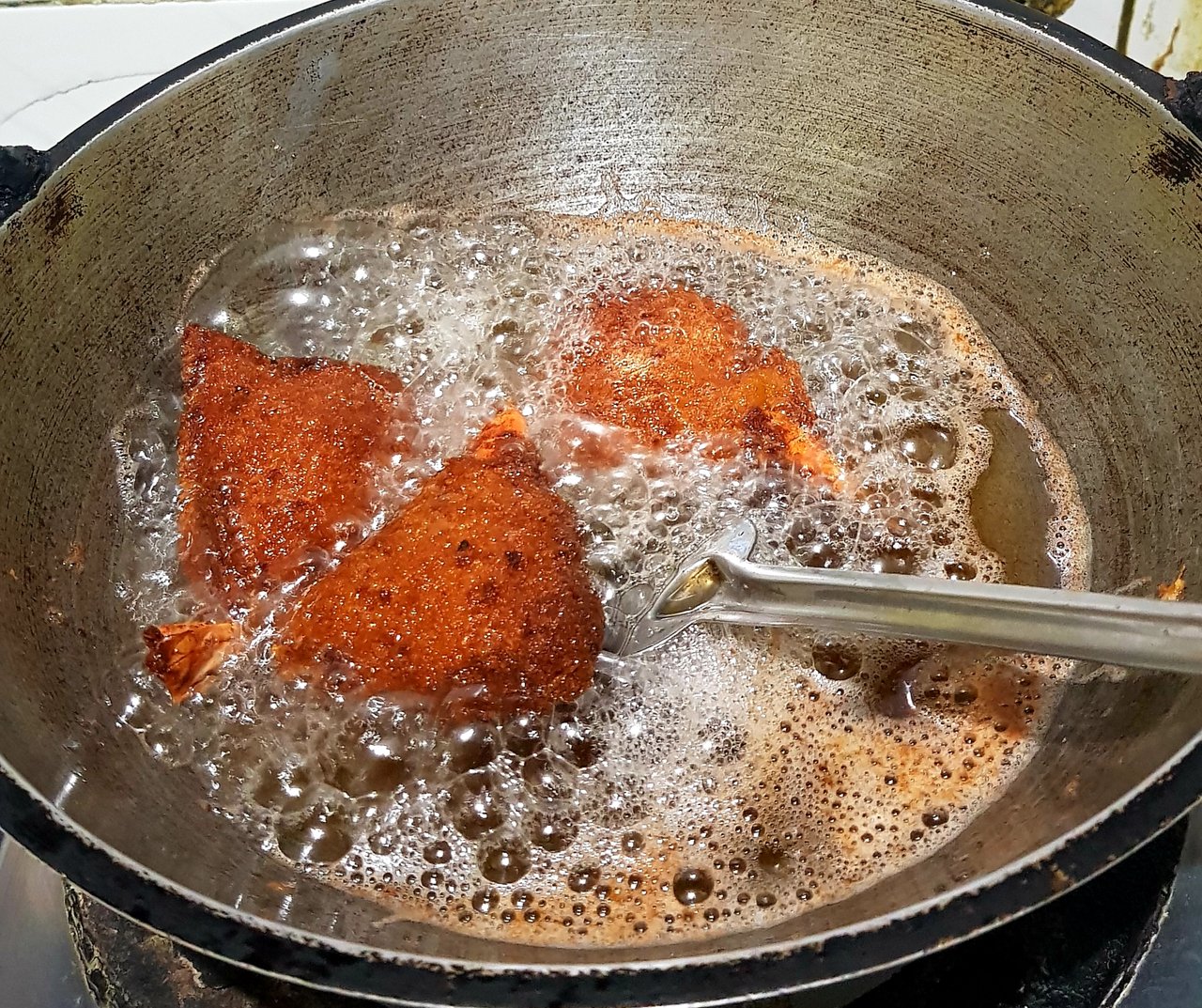এরপর এক ঘন্টা পরে ফিরে এসে প্লেটটা বের করে নিয়ে দেখব যে ব্রেডক্রাম্বগুলো চিংড়ি মাছের সাথে একেবারে সেট হয়ে গিয়েছে। তারপর চুলায় একটি করাই বসিয়ে তার ভেতরে পর্যাপ্ত পরিমাণে তেল দিয়ে দিয়েছি, তেল হালকা গরম হতেই তার ভিতরে একটা একটা করে চিংড়ি মাছ দিয়ে দিয়েছি। এখানে তেলটা পুরোপুরি গরম করে দিলে সাথে সাথে ব্রেডক্রাম্বগুলো উপর থেকে পুড়ে উঠবে ভেতরে কাঁচা রয়ে যাবে। এজন্য চুলার জ্বাল মিডিয়াম করে রেখে আস্তে আস্তে ভাজতে হবে।