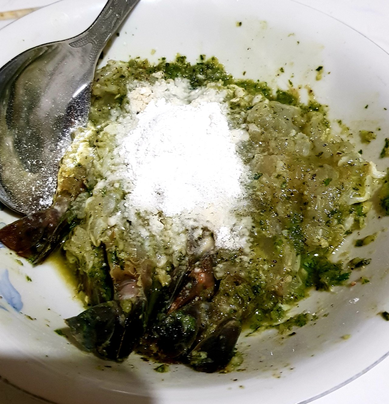 এরপর একটি ব্লেন্ডার নিয়ে আগে থেকে যে উপকরণগুলো রেডি করে রেখেছিলাম সেগুলো ব্লেন্ডারে দিয়ে দিয়েছি এবং কিছু গোল মরিচ দিয়ে দিয়েছি। তারপরে ব্লেন্ড করা হয়ে গেলে একটা বাটিতে তুলে নিয়েছি। তারপর ওই চিংড়ি মাছগুলো মেরিনেট হয়ে গেলে তার ভিতর থেকে কিছু পানি বের হয়েছিল পানিটা ফেলে দিয়ে আবার ওই ব্লেন্ড করা মসলাটা দিয়ে মাখিয়ে নিয়ে তার ভিতরে এক টেবিল চামচ কর্নফ্লাওয়ার ও হাফ চা চামচ লবণ দিয়ে আবার এক ঘন্টার জন্য মেরিনেট হতে রেখে দিয়েছি।