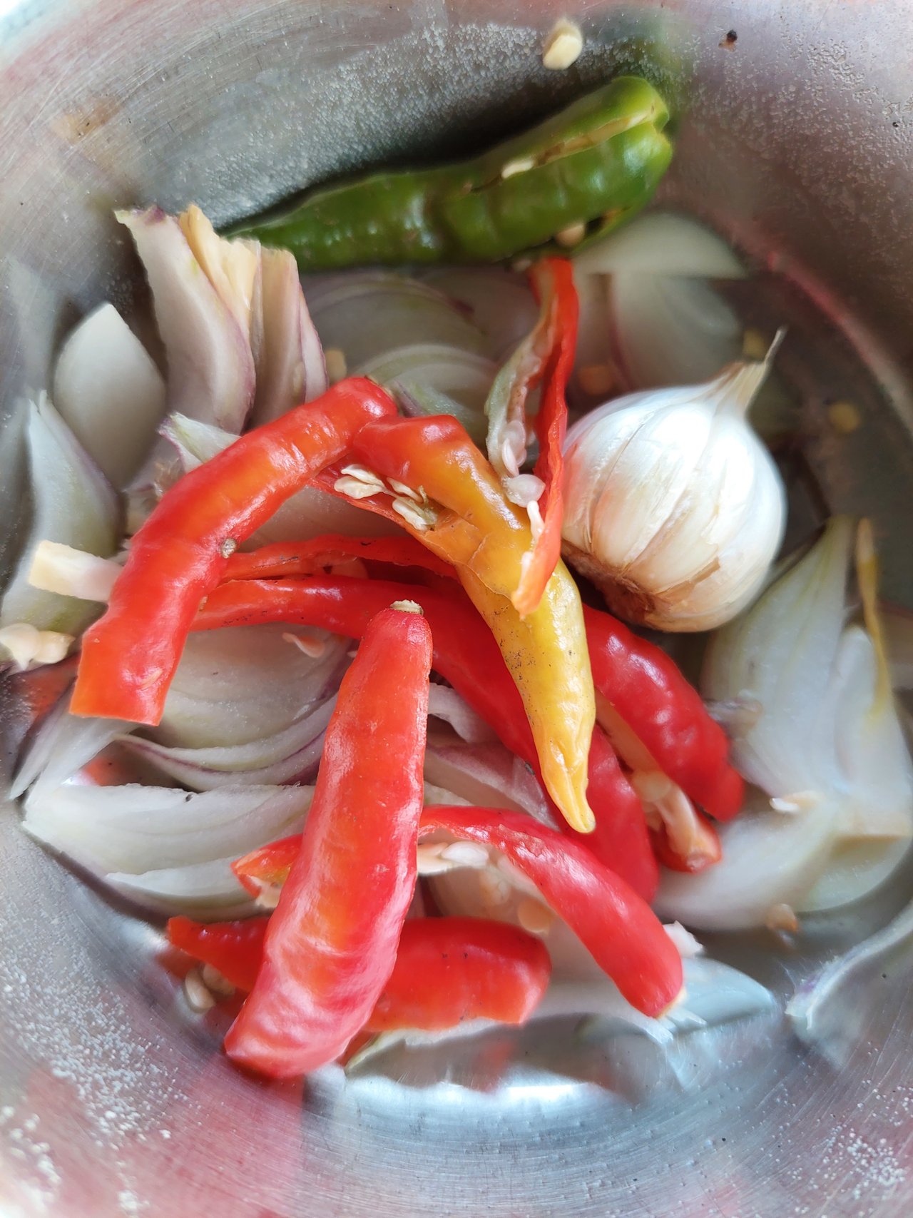 এবার আমি কিছু পেঁয়াজ এবং মরিচ এবং একটি রসুন পরিষ্কার করে কেটে একটি পাত্রে নিয়ে নেই। যা আমি আমার রান্নার কাজে ব্যবহার করব এগুলো আমার খাবারের স্বাদ বৃদ্ধি করবে।