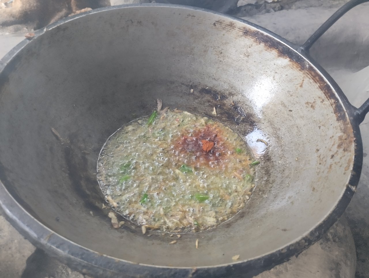 প্রথমে আমি কড়াইয়ে তেল নিয়েছি এবং এতে কুচি কুচি করে কেটে রাখা পেঁয়াজ দিয়েছি। |